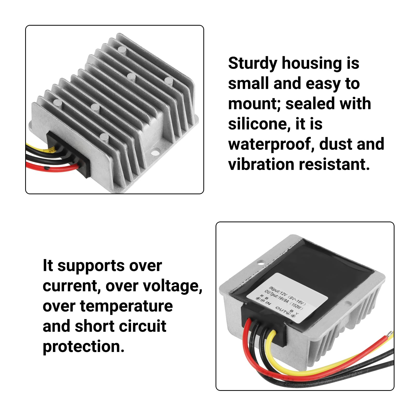 Alimentation Voiture 95W Convertisseur Élévateur Tension DC 12V à 19V 5A 95W Étanche Convertisseur étanche Protection Tension d'entrée: 12 V. Tension de sortie: 19 V. Courant de sortie: 5A. Puissance de sortie: 95 W. Température de travail: -40-80 Module convertisseur de tension Convertisseur élévateur de tension DC 12V à DC 19V 5A Régulateur Données techniques : Tension d'entrée : DC12V Tension de sortie : 19V Puissance de sortie : 95W Sortie nominale courant : 5A Efficacité de conversion : jusqu'à 96 % Taille : 7,4 x 7,4 x 3,2 cm Poids : 226 g Câblage : Le forfait comprend : 1 x module boost MAD Convertisseur élévateur Boost Converter DC 12V à 19V Étanche Step... Les adaptateurs de douille sont fabriqués en acier au chrome vanadium robuste pour une durabilité et une longue durée de vie. Avec surintensité, surtension, surchauffe, court-circuit et autres fonctions de protection automatique Application : Bus, écrans LED de voiture, caméras de surveillance, ventilateur électrique, pompe à eau, moteur, commande numérique photovoltaïque , pompes à eau, routeurs, interrupteurs, lumières LED, cadre photo numérique, réfrigérateur électronique, DVD portable, audio, systèmes de sécurité, outils portables, imprimantes, périphériques réseau, etc. Conception étanche: étanchéité en silicone organique, étanche, anti-poussière, antichoc, adaptée pour toutes sortes de mauvais environnements Description du produit Convertisseur boost d'alimentation de voiture 95W DC 12V à 19V 5A