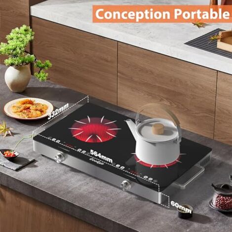 Cette plaque de cuisson électrique à un seul brûleur offre huit niveaux de puissance (de 100W à 2000W) et huit réglages de température (de 176 °F à 518 °F), vous permettant de l'adapter précisément à vos besoins. Contrôle Flexible du Temps VBGK plaque vitrocéramique 220V, minuterie 4 heures Table de Cuisson Electrique Portable 2000W : VBGK plaque de cuisson électrique fonctionne sur une prise standard de 220V à 240V, commune à tous les foyers nord-américains. Plaque de cuisson électrique 1 feu noir - Electroménager Essuyez-la simplement avec un chiffon propre une fois refroidie. La plaque vitrocéramique est idéale pour braiser, frire, mijoter, cuire à la vapeur, bouillir, sauter et rôtir. Plaque de cuisson en céramique intégrée 3 feux,Table de cuisson... La partie inférieure de la plaque de cuisson électrique à un seul brûleur est également équipée d'un ventilateur de refroidissement pour une durée de vie prolongée. Adaptée à Tous les Types D'ustensiles de Cuisine : VBGK plaque vitrocéramique est dotée d'un chauffage infrarouge et son panneau spécial est compatible avec tous types de casseroles et poêles. Tables De Cuisson Plaque Vitrocéramique Portable, Cooksir, 2000W, Plaque De Cuisson Plaque Cuisson électrique Portable Zones de cuisson 2000W Il vous permet de préparer rapidement plusieurs plats délicieux simultanément, ce qui vous permet de cuisiner plus en moins de temps. Utilisation en Toute Sécurité La plaque de cuisson électrique est équipée d'une sécurité enfant pour éviter toute ouverture accidentelle et protéger les enfants. Notre équipe après-vente professionnelle vous répondra sous 24 heures et vous apportera entière satisfaction. Pour toute question ou besoin, n'hésitez pas à nous contacter via Amazon. Elle est idéale pour cuisiner, mais aussi pour le camping, les bureaux, les résidences universitaires, les camping-cars, etc. Service Après-Vente : Nous offrons une garantie d'un an sur notre plaque de cuisson à induction portable, vous garantissant un achat en toute sérénité. Plaque Vitrocéramique Multifonctions : VBGK plaque vitrocéramique est fabriquée en céramique, un matériau à haute conductivité thermique qui dissipe la chaleur uniformément, pour une répartition plus équilibrée de la chaleur et une cuisson plus homogène. Facile à Nettoyer et à Refroidissement Rapide VBGK Plaques de cuisson : La surface étanche est facile à nettoyer, le ventilateur silencieux assure un refroidissement rapide et empêche les pièces internes d’être endommagées par les hautes températures. Rappel de Chaleur Résiduelle La surface de la plaque de cuisson est très chaude pendant et après utilisation. VBGK plaque vitrocéramique 1 feu à un seul foyer avec commande tactile, 8 niveaux de puissance, verrouillage enfant et minuterie, protection contre la surchauffe, indicateur de surface chaude, protection contre la surchauffe, plaque à induction portable, 36 cm, plaques de cuisson électriques avec surface en verre noir. Sublimez votre expérience culinaire avec une plaque de cuisson alliant fonctionnalité, efficacité et style, pour préparer des plats savoureux avec aisance et précision. Dimensions compactes (36 x 28 x 7 cm). Réchaud vitrocéramique 1 feu : Commandez sur - Réchaud Le panneau en cristal noir de la plaque de cuisson électrique portable à un seul brûleur est résistant aux rayures, à l'usure, aux hautes températures et est facile à nettoyer.