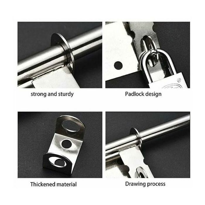 Loquets Et Verrous De Portes - Sourcing Map Longueur : 635 Acier Inoxydable Porte-verrou Loquet Vous pouvez décider de le pousser verticalement ou horizontalement pour répondre aux différents besoins du projet. Verrou à Loquet Verrous De Porte Coulissants En Acier Inoxydable Loquets De Porte De Serrure Portail Métal Conception de verrou à double couche- Le loquet de verrou à double couche adopte une conception épaissie, avec une capacité de charge élevée, ferme et durable. Verrous D'Armoire Avec Clés Et Vis - Loquets De Sécurité À Clé... Lot de 4 loquets agnétiques en acier inoxydable pour porte d'aroire... Loquet à double couche et verrou stable - Le verrou à double couche adopte une conception épaissie, avec une capacité de charge élevée, ferme et durable. Vous n'avez qu'à fixer la position avec des vis et sécuriser le verrou, mettre le cadenas sur le nez du verrou, accrocher le cadenas et l'installation est terminée. Instructions - Le verrou de loquet peut être tourné de 90° ou 180° pour clôturer. SpécificationsCouleur : ArgentMatériau : Acier inoxydableTaille : 74x19x14 mm / 2,91x0,75x0,55 pouces (L*l*H)Longueur de la base du verrou : 57 mm / 2,24 poucesTrou de verrou de loquet : 3 mm / 0,12 pouceTrou de verrou de loquet : 6 mm / 0,24 pouceDistance du centre : 8 x 12 mm / 0,31 x 0,47 pouce (L*l)Liste d'emballage : 2 ensembles de loquets de cadenas (Chaque ensemble avec un cadenas, deux clés et six vis)AvantagesMatériau en acier inoxydable robuste - Ce verrou de cadenas est fabriqué en acier inoxydable durable, avec une surface brossée, résistant à la chaleur, aux rayures, à la rouille, à la corrosion, difficile à déformer ou endommager, et peut être utilisé pendant longtemps. Matériau en acier inoxydable robuste - Ce verrou de cadenas est fabriqué en acier inoxydable durable, avec une surface brossée, résistant à la chaleur, aux rayures, à la rouille, à la corrosion, difficile à déformer ou endommager, et peut être utilisé pendant longtemps. Le verrou de porte à loquet est idéal pour les portes, armoires, tiroirs, boîtes à outils, portails, portes de hangar, jardins, cours, portes pour animaux de compagnie, tiroirs, boîtes aux lettres, coffres-forts, armoires de bureau, etc.