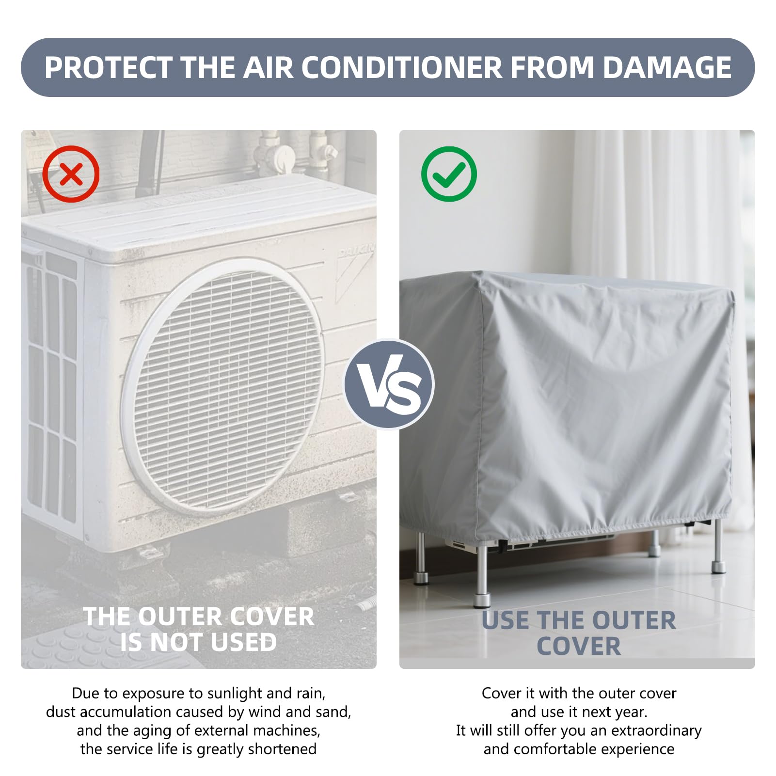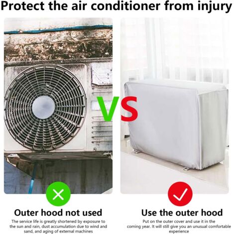 Housse climatiseur extérieure, universelle, imperméable, anti 5, La housse de climatiseur peut être utilisée tout au long de l'année, en particulier au printemps, en été, en automne et en hiver lorsque le climatiseur n'est pas utilisé. Housse De Protection Tuyau Climatiseur Interieur Couvercle De Climatiseur Extérieur, XU, Housse Climatiseur Extérieur Poussière, Anti Poussière Anti-Neige Imperméable Housse Pour Climatiseur De Maisons (86 35 60cm) - KZQ Couverture Protection Climatiseur Anti-poussière 3, Faites attention à la sécurité lorsque vous travaillez en hauteur. Housse De Climatiseur Intérieur, Couvercle De Climatiseur Portable... Durable]Le couvercle du climatiseur est étanche à l'eau, à la poussière et au soleil.Protection contre la neige, protection contre les rayons UV, la pluie... Vous n'avez pas besoin de le laver lorsqu'il est sale, il suffit de l'essuyer avec un chiffon. matériau de protection à haute efficacité, prolonge la durée de vie, peut être utilisé tout au long de l'année, aspect argenté moderne et simple, convient à divers environnements tels que la maison, l'école, le lieu de travail et ainsi de suite. Le tissu est durable, ne se casse pas facilement et dure plus longtemps. Merci de votre compréhension., 2., Ne pas utiliser d'eau chaude pour le nettoyage. TAILLE UNIVERSELLE : 2P : 86 × 35 × 60 cm / 33., 85 × 12., 60 × 22., 05 inch ; Convient à l'unité extérieure de climatiseur 2P, veuillez mesurer la taille de votre unité extérieure de climatiseur avant l'achat. Spécification Matière : Polyester., Couleur : argent., Quantité : 1 pièce.