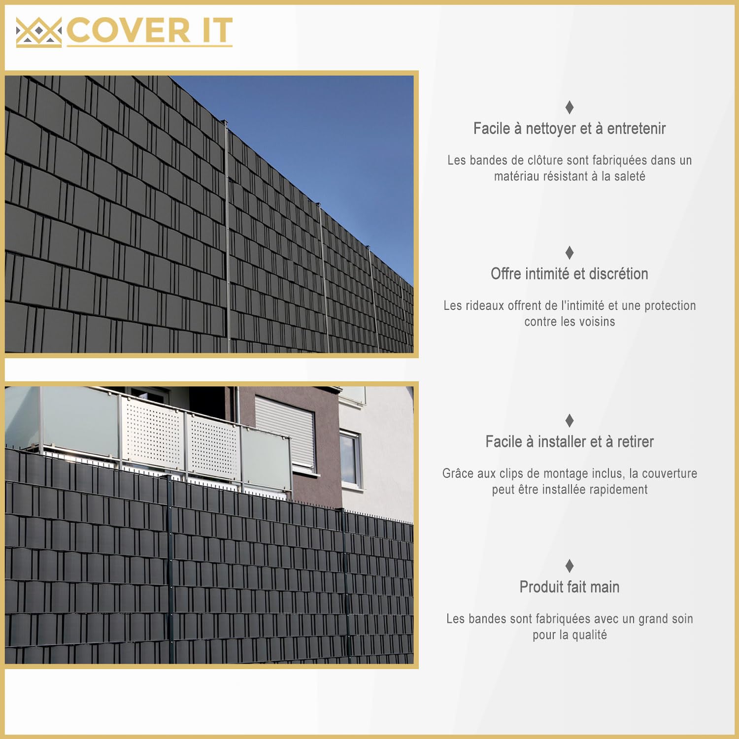 Cover IT Graphite Occultant Cloture 19x98cm - Avantage durable – pendant de nombreuses années. La occultant grillage rigide étanche ne fuit pas ; il ne pourrit pas et n'a pas besoin... Écran de confidentialité pour clôture à mailles losangées, il est également étanche. Utilisation durable : pendant de nombreuses années. Votre vie privée - Avec ce produit, vous pouvez protéger votre pièce des regards des voisins et même des voleurs. Le produit imperméable ne fuit pas. Profitez de l'intimité dans des conditions confortables. Fixez rapidement et sans stress la clôture brise-vue de jardin à la clôture en quelques minutes Clôtures & Occultation : Experts en Grillages et Occultation Il ne pourrit pas et n'a pas besoin d'être séché. L'assemblage se fait en 3 étapes simples ! Brise Vue PVC Résistant UV Gel Vent Cover It Graphite Occultant Cloture 4,7cmx98m - Brise Vue Brise Vue Jardin Nous incluons un ensemble de clips avec chaque commande, avec lesquels vous pouvez attacher rapidement et facilement les bandes à la clôture. Première étape : enfilez le ruban adhésif entre les dalles ou les balustrades du jardin. Grâce à la stabilisation appliquée, les rideaux ne perdent pas leur couleur et conservent leurs propriétés naturelles pendant de nombreuses années. Il est difficile de profiter de votre jardin lorsque vous êtes à la vue de tous vos voisins ? Nos lamelles d'occultation pour grillage rigide sont idéales pour protéger votre intimité et clôturer votre terrain ! N’hésitez plus, profitez de notre gamme de brise-vue ! Lamelle à tresser, canisse PVC ou encore kit de lame d’occultation en PVC, il existe de nombreuses variations de... Le panneau double fil ne perd pas ses couleurs sous l'influence des rayons UV Vous pouvez également les mettre dans de l'eau chaude, cela les rendra plus souples. Vous pouvez créer vos arrangements Elles sont composées d'un matériau très durable et rigide avec un poids de 150 g/m² Deuxième étape : enroulez l'extrémité du ruban autour du poteau de clôture. Wide Swing : vous pouvez monter la clôture décorative dans des clôtures en panneaux, sur le balcon et la terrasse sur les conteneurs à ordures et les terrains.