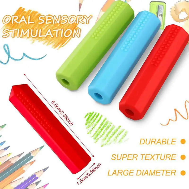 Silicone Alimentaire Mastication Toppers Sensoriels Pour Crayons à Croquer,Toppers Sensoriels Accessoire Anti-stress POT A CRAYON,Rouge--Lot de 6 porte crayons amusants pour chat Ce lot de 3 crayons sensoriels est spécialement conçu pour les petits qui ont constamment besoin de mettre quelque chose dans leur bouche. En silicone... Ils sont faciles à nettoyer et à entretenir, ce qui en fait un ajout pratique à votre routine quotidienne. Idéals pour les personnes ayant des besoins particuliers, ils facilitent la concentration et favorisent le calme chez les et les adultes. Fiable et sûr : fabriqués à partir de matériaux en silicone de qualité alimentaire de haute qualité, ces cache-crayons sensoriels offrent une solution fiable pour ceux qui ont besoin de mâcher tout en offrant une concentration améliorée. 3 X De Crayon À Mâcher Sensoriel,Jouets De Décoration De Crayons À Croquer En Silicone,Toppers Sensoriels,Embout Stylo À Mordiller Colorés,Soulage Le Stress Et L'anxiété Pour,adolescentsLot De 3 Décorations Sensorielles À Mâcher Pour Crayons,Jouets De Décoration De Crayons À Croquer En Silicone,Jouets Sensoriels À Mâcher,Cadeaux De Fête Pour Garçons Et Filles3 pcs Embout De Crayon À Mâcher Sensoriel, Crayon À Mâcher Silicone, Capuchons Fidget Colorés En Silicone Pour Crayons, Crayons Mâcher Sensoriels Pour La Dentition, L'autismes, Le TDAH cache-crayons à croquer sont parfaits pour les adolescents et le lieu de travail. De plus, ils sont faciles à nettoyer pour une utilisation durable Design attrayant : avec leurs couleurs vives et leur design captivant, ces surmatelas à mâcher calment le stress et les tensions, parfaits pour ceux qui ont besoin de confort pendant de longues heures de travail ou d'étude. Bon choix : conçus pour les et les adolescents, ces cache-crayons à mâcher, une option réfléchie pour les jeunes, les garçons et les filles, améliorent la concentration grâce à la stimulation sensorielle Jouets sensoriels - La Looma