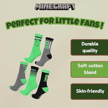 Rated 5 de 5 de quetzalgirl par Chaussettes juste ce qu'il faut de MinecraftLes logos sont sur le dessus du pied, comme ça on peut leur faire plaisir en restant discret sur la partie visible... Lot de 3 paires de chaussettes au design Creeper La taille des chaussettes est très élastique Chaussettes Minecraft Chaussette Minecraft Creeper - Lot De 3 Ou 5 Paires En Coton Pour Garçon - Cadeau Fan Chaussettes Gamer Coton La taille des chaussettes est très élastique avec trois designs différents des chaussettes Minecraft Taille junior 6-8,5 / 24-26,5 cm, taille junior 9-12 / 27-30 cm, taille enfant 12,5-3,5 / 31-36 cm, taille enfant 4-6,5 / 37-40 cm Ces chaussettes confortables Minecraft Creeper seront parfaites pour une dure journée à jouer au classique de la construction du bac à sable Produit sous licence officielle Minecraft Lot de 3 chaussettes originales pour le jeu culte Minecraft au design Creeper - Haute teneur en coton pour un confort optimal. Accessoire Minecraft Lot De Chaussettes Minecraft Creeper - 3 Ou 5 Paires - Coton Haut - Taille Enfant 27-42 - Cadeau Chaussettes Gaming
