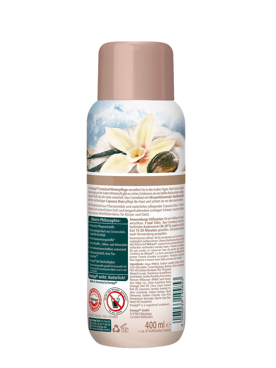 Le bain crème au lait de millet, à l'extrait de vanille et à la riche noix de Cupuacu nourrit la peau et la protège du dessèchement. Kneipp Skumbad Skum- & cremebad Aroma-plejeskumbad Erkältungszeit Forkølelsestid 400 400ml... Bains Moussants Cremebad Rosenzarte Verwöhnpflege Soin Peau Sèche Bain Hiver Hautpflege für Körper und Gesicht Après une longue promenade dans l'air froid de l'hiver, il n'y a rien de mieux qu'un bain chaud et le parfum chaleureux qui caresse l'âme. Description du produit Le soin d'hiver Kneipp vous dorlote pendant les journées froides.