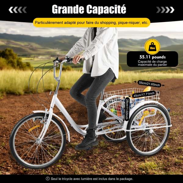 Largeur du cadre : 68 cm. SAYOBO Tricycle électrique familial de 61 cm pour adultes à 3 roues Des matériaux de haute qualité tels que le guidon en aluminium et le siège en polyuréthane assurent une longue durée de vie. Tricycle Pliable 7 Vitesses 24 Adultes Tricycle Cruiser Bicyclette Tricycle Tricycle Avec Panier Tricycle Shopping Extérieur Velo Tricycle Adulte Dimensions de l'emballage : 109 x 28 x 65 cm / 42,91 x 11,02 x 25,59 pouces Charge maximale : 120 kg. Hauteur de la selle : 98,5-117 cm., Poids net : 25,85 kg., Poids brut : 29,9 kg. Vélo pour personnes âgées de 24 pouces Tricycle 6 vitesses avec panier... Les pneus en caoutchouc antidérapants avec profil assurent une sécurité supplémentaire, même sur les routes humides. Les pneus larges et le centre de gravité bas assurent une expérience de conduite légère et sûre sans avoir à maintenir votre équilibre. Le Tricycle TRAD 24 a été conçu pour offrir stabilité, confort et sécurité, avec une attention particulière portée à la facilité d’enjambement grâce à son marchepied extra-bas de seulement 19 cm. Il convient parfaitement aux déplacements du quotidien, aux courses ou aux balades en toute sérénité Avertissement De Sûreté Voir la description Contenu de l'emballage : 1 tricycle de 24 1 manuel d'utilisation en anglais (français non garanti). ✅ Haute résistance et durabilité : cadre robuste en acier au carbone à haute résistance avec revêtement en poudre antirouille – Charge maximale : 120 kg. Hauteur de la pédale au-dessus du sol : 12 cm. ✅ Pliable et adapté à un usage quotidien : se replie facilement, économise de l'espace de rangement et est pratique à transporter dans la voiture.