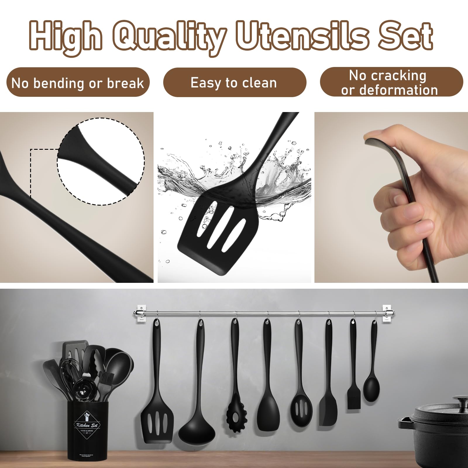 Ustensiles Lavables Lave-vaisselle VINATO Couteau Cuisine, Couteau De Cuisine 14 Pièces Avec Aiguiseur 12 Pièces Sans Bpa Noir Accessoires Friteuse - Cecotec - Cecofry Silicone - Kit 6 pièces - Sans Lot de 12 ustensiles de cuisine en silicone, résistants à la chaleur, antiadhésifs, lavables au lave-vaisselle, ergonomiques, alimentaires, avec porte... Ce set ustensile cuisine convient au contact alimentaire lors de la cuisson, du mélange ou de la friture. Les ustensiles de cuisine silicone n'altèrent pas les saveurs des aliments. Les bords arrondis réduisent les risques de rayures sur les poêles (les parties en acier inoxydable ne conviennent pas aux températures excessives). Matériau pour Aliments:Fabriqué en silicone alimentaire et acier inoxydable sans BPA. Set Complet de 12 Pièces :Contient : 1 spatule cuisine, 1 séparateur d'œufs, 1 pince à pâtes, 1 écumoire, 1 fouet, 1 pince à pain, 1 louche, 1 cuillère à soupe, 1 louche cuisine, 1 raclette, 1 pinceau + seau de rangement. Optimisation d'Espace:Chaque pièce des ustensiles de cuisine possède un trou de suspension à l'extrémité. Des ustensiles de cuisine fonctionnels pour un usage domestique régulier. Nous comparons pour vous ustensile de cuisine de VINATO, hicoosee, ReaNea et de nombreuses autres marques