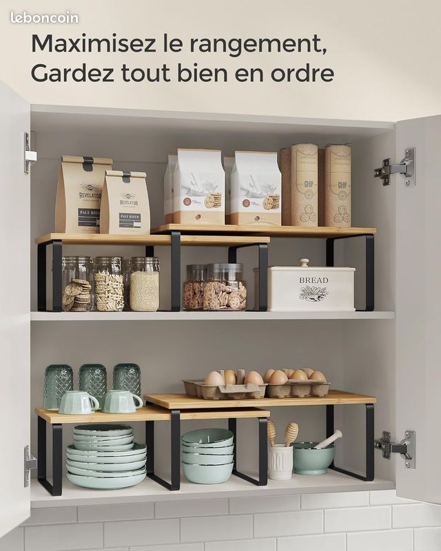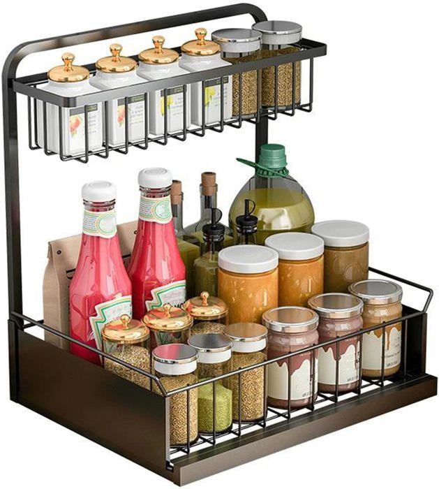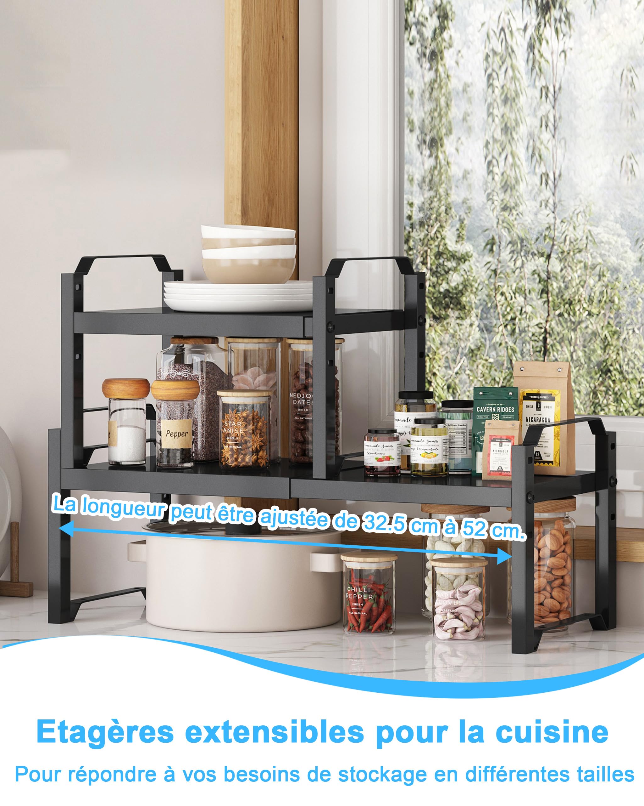 étagère Extensible épices X-cosrack 2 Porte-Épices Empilable Rangement, Organisateur Étagère Cuisine Extensible De 32 À 52 Cm,Métal Rangement Placard Réglable En Hauteur Pour Meuble Cuisine Et Plan De Travail, 30lbs étagère Cuisine Extensible 32-52cm Rangement Epices Cuisine 4 Cases en Métal Mural - Sans Percer : Adhésif OU Vis pour Mur Cuisine/Porte Placard - Gain de Place, Design Élégant (Noir Porte-épices, 2 Niveaux Porte-épices Rotatif Extractible Cuisine 【Robuste et durable】 Avec son cadre métallique de haute qualité, l'organiseur de cuisine dispose d'une structure très robuste pouvant supporter jusqu'à 30 lb sans s'affaisser ni se déformer. Guador Étagère à Épices Epilable, 3 Pièces Organisateur D'aroires... Il vous suffit de serrer quelques vis pour assembler rapidement l'étagère. 【Longueur et hauteur réglables】 L'organiseur de cuisine en métal peut être étendu d'une longueur de 12,5« à 20,5 », et la hauteur de la planche peut être ajustée pour accueillir des articles de différentes tailles. 【Optimise l'espace vertical】 Tirez le meilleur parti de l'espace vertical grâce à notre petit étagère métallique extensible et empilable. Ils sont donc parfaits pour ranger la vaisselle, les accessoires de cuisine, les conserves et bien plus encore !