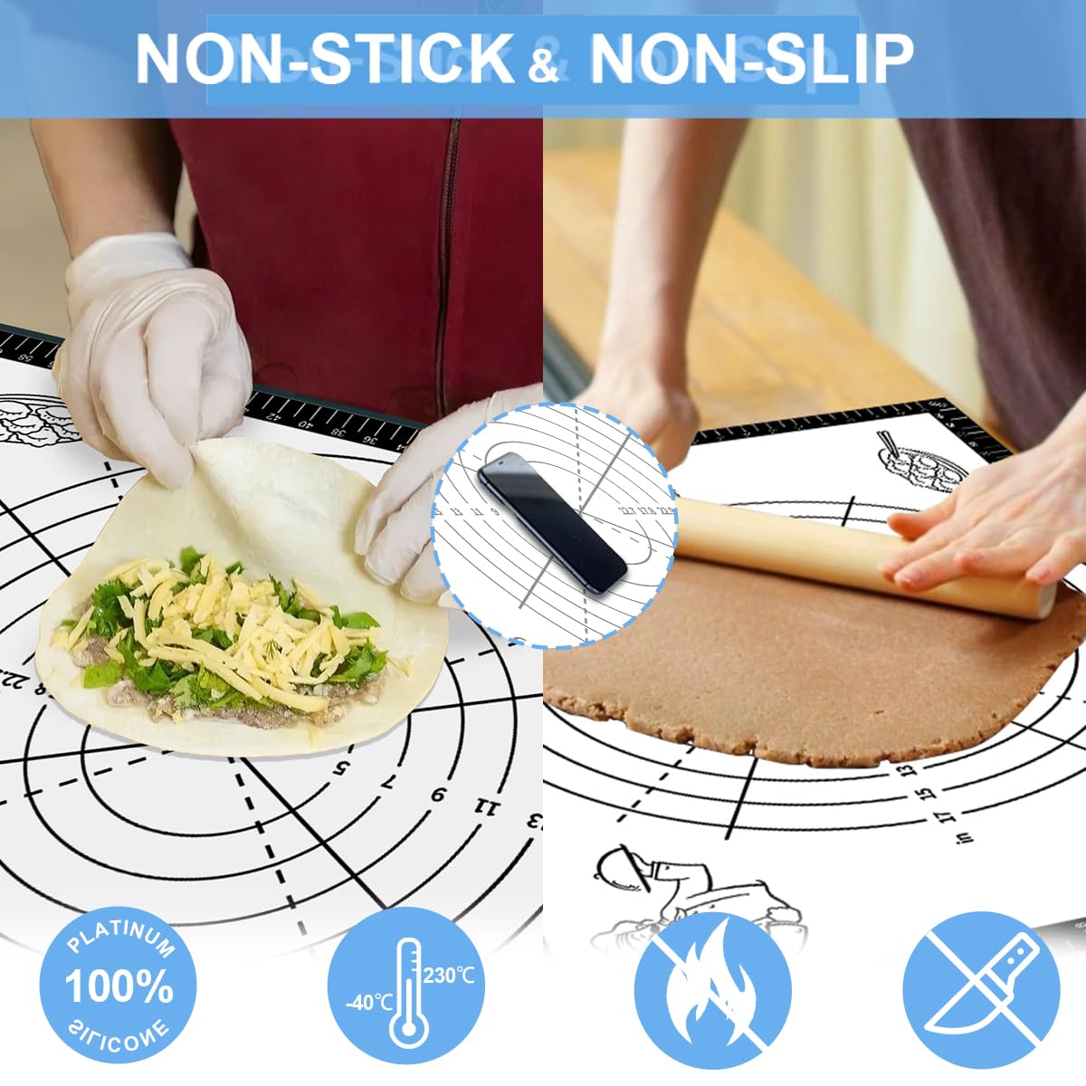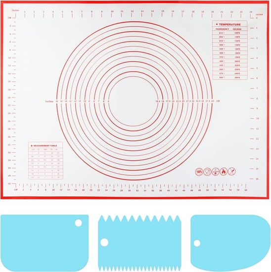SPECIFICATIONS - Matériau : Silicone - Couleur : Noir + Blanc - Dimensions : 70 × 50 cm CONTENU DE L'EMBALLAGE 1 × Tapis Silicone Patisserie 3 × Racleurs à pâte Tapis de Cuisson Silicone, 70 x 50c Tapis Cuisson Antidérapant, Reutilisable, Plaque Silicone Le tapis de cuisson silicone peut également être enroulé ou plié de manière flexible, ce qui économise de l'espace dans la cuisine et facilite son rangement dans un tiroir ou un placard. Tapis Silicone Patisserie 2 Pièces Tapis Cuisson,30x40 C Tapis De Cuisson Silicone Pour Four,Plaque Silicone Four,Feuille Tapis Cuisson Antidérapant 70x50 Cm Réutilisable Racleurs pratiques et faciles à utiliser : Le tapis cuisson patisserie est accompagné de 3 racleurs à pâte, en matériau de qualité, faciles à manipuler, et aide à gérer facilement la pâte. MULTIFONCTIONNALITÉ:Le tapis silicone patisserie a des dimensions de 70 × 50 cm et offre un espace suffisant pour les opérations telles que le pétrissage et le laminage de la pâte. Lazyi Antidérapant Tapis de Cuisson en Silicone extra épais, Anti-Adhérent Feuille de Cuisson... ENSEMBLE PRATIQUE:Cet tapis cuisson silicone contient une nappe à cuisson pratique et 3 racleurs à pâte, c'est le choix idéal pour les amateurs de cuisine. ANTI-ADHÉSIF ET ANTI-DÉRAPANT:La surface anti-adhésive du tapis de pâtisserie en silicone ne retient pas facilement la pâte, ce qui facilite l'opération. Les mesures sont en impérial et en métrique pour atteindre des résultats parfaits !,Antiadhésif et facile à nettoyer : Le tapis de pâtisserie antiadhésif crée une surface idéale pour éviter que votre pâte ne colle au tapis de pâtisserie en silicone et pour garder les surfaces de travail propres Il peut être utilisé pour préparer différents plats tels que la pâte à sucre, la pizza, etc Le tapis patisserie silicone est doté d'indicateurs de mesure et est accompagné de 3 racleurs à pâte. La propriété anti-dérapante permet au tapis de patisserie plan de travail de s'étendre stablement sur le plan de travail, sans se déplacer ni se plier, améliorant l'expérience de cuisson Couleur classique et polyvalente : L'apparence du tapis de cuisson en silicone anti-adhésifs combinée à une couleur classique s'adapte à tous les styles de cuisine. Il ne se plie pas facilement et ne perd pas sa couleur