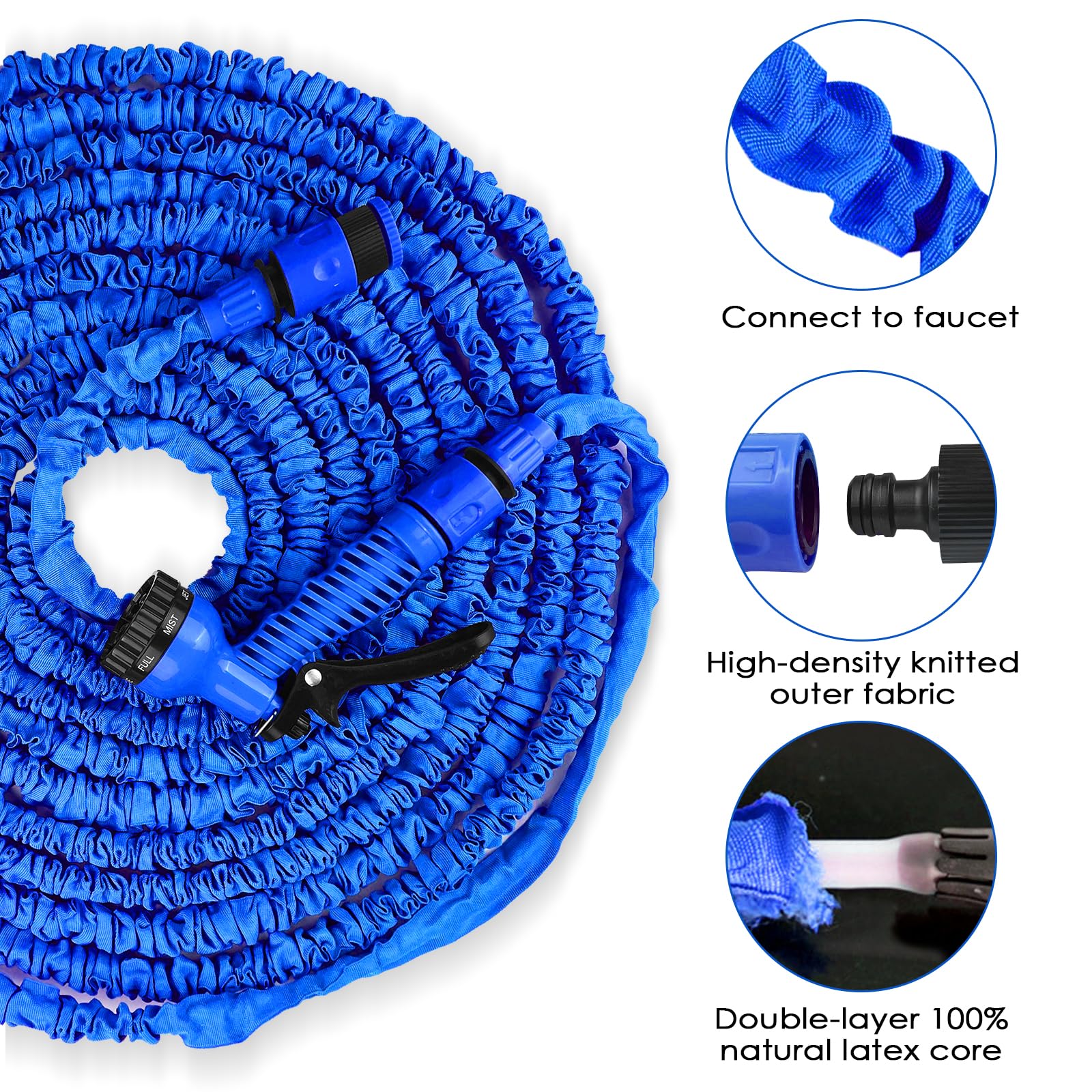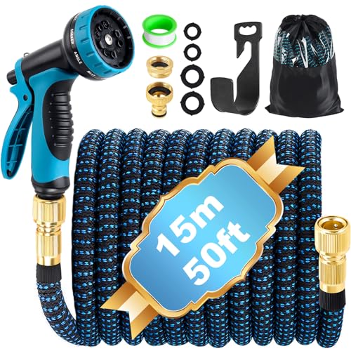 Tuyau Douche Lahnaokfis 7.5m Tuyau D'Arrosage Extensible, Tuyau Arrosage Tuyau Arrosage Extensible 60m Tuyau D’Arrosage Extensible 30M, Tuyau D'Arrosage Avec 10 Buses De Tuyau D'Arrosage Extensible, Tuyau D'Arrosage Extensible De 30.5 M... La surface extérieure est enveloppée de fibre de polyester, il n'y a donc pas besoin de s'inquiéter du frottement direct entre le tuyau d'eau et le sol, et il n'y a pas besoin de s'inquiéter des fuites ou des ruptures. 【Facile à utiliser et à ranger】Conception ergonomique, poignée antidérapante, utilisation facile. Une fois que l'eau passe à travers le tuyau d'arrosage, le tube s'étend 3 fois sa longueur. 【Matériaux durables et de haute qualité】Tuyau d'Arrosage Extensible adoptant un noyau en latex haute densité et un revêtement en fibre de polyester, le tuyau d'eau flexible et rétractable ne se pliera pas ou ne se tordra pas pendant l'utilisation. 【7 méthodes de pulvérisation d'eau】Tuyau d'Arrosage Extensible avec 7 fonctions, il offre plus de choix. Il peut également être utilisé pour le nettoyage de la maison, de la voiture, du sol, des trottoirs, du nettoyage des animaux domestiques, de l'irrigation des plantes tendres, etc. Il convient à tous les âges et a une longue durée de vie. Le mode de pulvérisation peut être facilement changé en tournant le régulateur de débit d'eau et le déflecteur, ce qui peut facilement répondre aux besoins d'arrosage des plantes, d'arrosage, de lavage de voitures, de bain d'animaux domestiques, de nettoyage des terrasses, etc. LINGKY Tuyau Arrosage Extensible 7.5m, Tuyau d'arrosage...