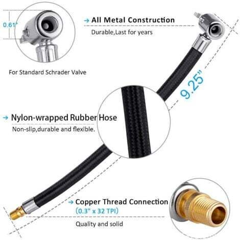 Dtoterul Tuyau Gonflage Pneus, Adaptateur de Tuyau de Gonflage de Pneu, Tube d'Extension de Gonfleur de Pneu, Tuyau Pompe Gonflage Pneu, 36cm/14.17pouces, Universel, Adapté aux Vélos, Voitures, Motos Le tuyau de gonflage des pneus est équipé d'un excellent mandrin à air à verrouillage étanche, durable et flexible, sans fuite, et peut être utilisé en toute... Tuyau Extension Air Unique Bargains Tuyau D'Extension De Gonfleur De Pneu 50cm Adaptateur De Mandrin Tube De Pompe à Air Valve De Pneu Pour Voiture Ton Cuivre Noir Rallonge Gonflage Pneu Vélo Voiture Description du produit Extension de gonfleur de pneu, extension de tuyau d'air Verrouillage du pouce en alliage de zinc : doté d'un verrouillage du pouce en alliage de zinc, cette extension peut empêcher efficacement les fuites, garantissant un gonflage sûr et stable et une résistance à la pression à haute résistance ; les points forts incluent un tuyau d'air haute pression avec une étanchéité à l'air optimale Dioche Tuyau d'extension de gonflage de pneu Tuyau d'extension de... Matériaux durables : notre extension de gonfleur de pneu est dotée d'une construction robuste, fabriquée à partir de cuivre et de caoutchouc de haute qualité pour une durabilité accrue. Largement utilisé : équipé d'un tuyau d'extension, notre extension de gonfleur de pneus s'adresse à divers véhicules, y compris les vélos, les chariots, les motos et les voitures. Utilisez-le à tout moment et n'importe où pour un gonflage pratique et sans tracas. Utilisation pratique : elle est légère et simple à transporter, ce qui rend cette extension de gonfleur de pneu suffisamment compacte pour être emportée avec vous à l'extérieur.