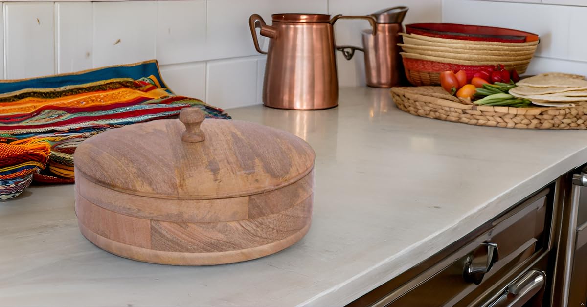 Panier Garde-chaud Tortillas HOMEKOKO Boîte à Pain D'angle En Bambou Double Couche Pour Comptoir De Cuisine, Bac De Rangement Panier à Tortilla Mexicain 22cm Chauffe-Tortilla et Garde Parfait Pour Garder Les Tortillas, Crêpes et Tacos au Chaud Presse à tortilla boulette de bois pâte à pizza presse à pâtisserie... Peut contenir un grand nombre de tortillas mexicaines ou de rotis indiens. Multifonction : vous pouvez utiliser nos supports pour tortilla / roti non seulement pour garder vos tortillas mexicaines à la farine ou au maïs, tacos mous ou rôtis indiens au chaud, mais également pour les produits de petit-déjeuner tels que les crêpes, les gaufres, les crêpes et le pain. En raison de la couleur chaude du bois, de l'élégance, du design simple mais robuste et durable, le support s'adaptera parfaitement à n'importe quelle table, des repas quotidiens aux occasions spéciales The Great Indian Bazaar Durable : chaque pièce est fabriquée individuellement à la main avec soin et attention dans de petites communautés artisanales du nord de l'Inde, en utilisant des outils artisanaux simples avec du bois de manguier de haute qualité, récolté légalement, obtenu par des chaînes gouvernementales autorisées afin de soutenir à la fois l'environnement et les moyens de subsistance des artisans Cadeau : notre gardien de tortilla mexicaine/roti indien est un cadeau parfait pour les occasions spéciales : mariages, pendaisons de crémaillère, anniversaires, fête des mères, fête des pères ou Noël Votre achat est également protégé par la politique de retours, de remboursement et de remplacement d'Amazon. PRESSE À TORTILLA en bois, presse-tortillera mexicain pour tacos, pour...
