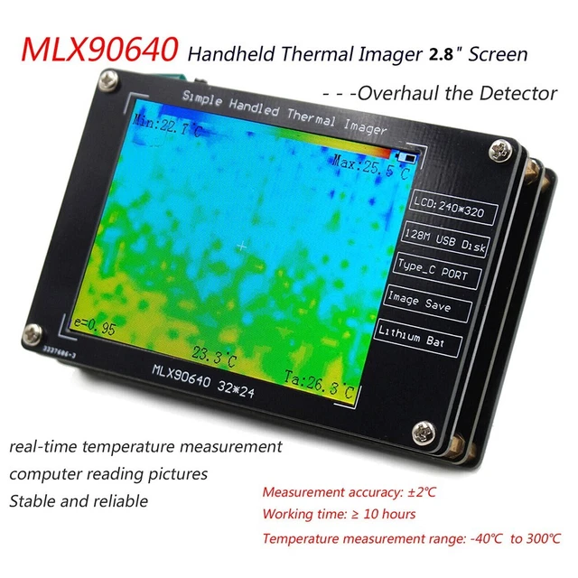 TMISHION Caméra thermique Imageur thermique DIY Caméra d'imagerie infrarouge rechargeable Mode d'alimentation : interface OTG pour téléphone portable, port TYPEC requis. Application Thermique Téléphone MiLESEEY TR256i Caméra D'imagerie Thermique Pour Android Type-C Caméra Thermique Bosch Précision de mesure : 1 degré Celsius. Affichage d'image en temps réel : surveillez instantanément les changements de température avec des images de distribution de température en temps réel... YOSOO Caméra thermique Imageur thermique DIY Caméra d'imagerie... Facile à utiliser avec support d'application : installez simplement l'application correspondante sur votre téléphone, dans l'imageur thermique, et commencez à capturer des images thermiques. Contenu de l'emballage : 1 imageur thermique MLX90640., [Image thermique compacte] L'imageur thermique MLX90640 est un appareil compact mesurant seulement 50 x 22 x 11 mm, conçu pour se connecter facilement à votre téléphone via une interface de type C, ce qui en fait un outil pour mesurer la température en déplacement. Il prend en charge la fonction OTG pour un fonctionnement fluide avec les appareils compatibles. Modèle de capteur : MLX90640-BAB Champ de vision : 55 x 35 °C. [Surveillance de la température en temps réel] Expérimentez l'affichage en temps réel des images de répartition de la température, vous permettant de surveiller les schémas de chaleur instantanément et efficacement pour diverses applications telles que les inspections à domicile ou les tests électroniques. Caractéristiques : 1., Convient pour les téléphones Android, avec application, et pour jouer., 2., Prend en charge l'affichage en temps réel des images de répartition de la température., 3., La meilleure distance d'utilisation est de moins de 2 mètres., 4., Prend en charge le réglage de la fréquence de rafraîchissement, la mise en miroir de l'écran et d'autres Caractéristiques : Nom de la pièce : imageur thermique MLX90640., Matériau : ABS., Couleur : noir.
