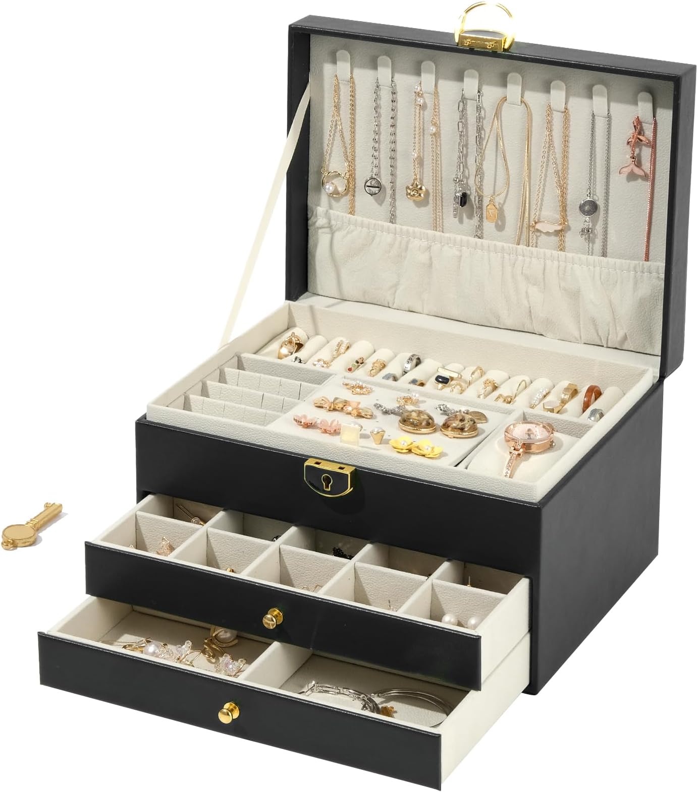 Casiwaft Boîte à Bijoux 3 Couches, Coffre à Bijoux Grand, Grand Organisateur de Bijoux avec Relaxdays Boîte à bijoux, écrin effet cuir, casier porte-bagues... Vitrine Boutique Maison Rangement Boucles D'oreilles Colliers Organisateur Bijoux Rotatif Double Face - Suspension Mural - Poches Transparentes Organisateur Colliers Boucles Organisateur Colliers Crochets Description: - 【Grande capacité】 : organiseur de bijoux multi-crochets, plateau vide pour bijoux, offre suffisamment d'espace pour exposer vos bijoux sans prendre trop de place - 【Matériau de qualité supérieure】 : l'étui de rangement pour boîte à bijoux adopte des matériaux en velours et en panneau composite, est robuste et a une longue durée de vie. 【Vitrine】 : vitrine à bijoux multi-crochets pour colliers, qui présente les bijoux de manière élégante pour une visualisation et une recherche faciles. Boîte à bijoux pour collier de perles noires, mallette de rangement avec couvercle, verre anti-poussière, Long Bracelet, perles, porte-collier épais... 【Larges applications】 : plateau à bijoux pratique, adapté aux tiroirs, commodes, vitrines, comptoirs, maisons, magasins de détail, magasins, comptoirs, stands de marché nocturne, etc. Boîte à bijoux empilable avec plateau en verre verrouillable, gain de place Doublure douce, ne rayera pas vos bijoux 【Matériau de qualité supérieure】 : l'étui de rangement pour boîte à bijoux adopte des matériaux en velours et en panneau composite, est robuste et a une longue durée de vie.