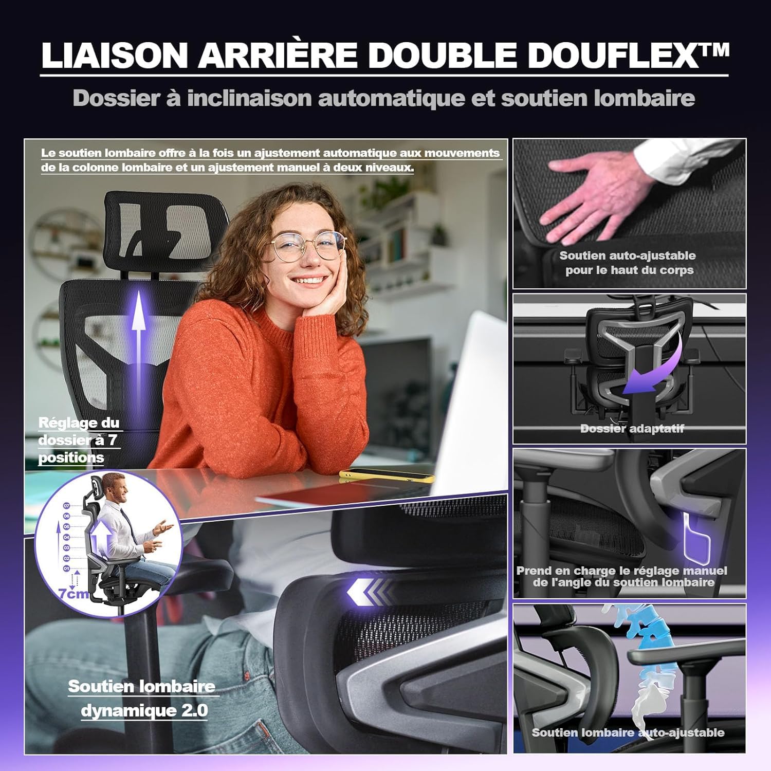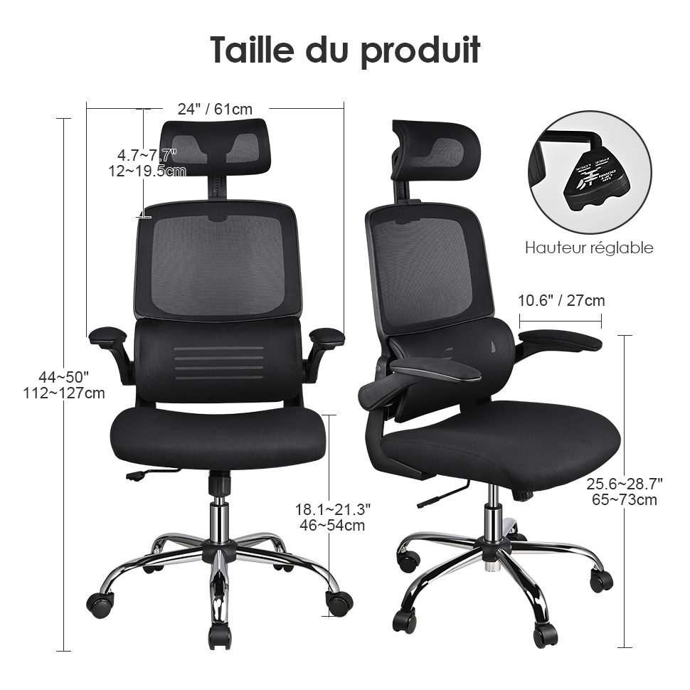 Elles glissent en douceur sans rayer le sol, tout en prolongeant la durée de vie du siège et du revêtement. ELOKEA Chaise de Bureau 200 kg, Fauteuil de Bureau Ergonoique 200 kg... 【𝐂𝐡𝐚𝐢𝐬𝐞 𝐗𝐋 𝟐𝟎𝟎 𝐤𝐠 𝐏𝐨𝐮𝐫 𝐆𝐫𝐚𝐧𝐝𝐬 𝐏𝐞𝐫𝐬𝐨𝐧𝐧𝐞𝐬】Grande assise avec réglage de profondeur (4 cm), dossier ajustable en hauteur (6 cm), siège 48-59 cm, appuie-tête 2D réglable (8 cm, rotation 90°). Pour votre confort et satisfaction, nous avons entièrement amélioré le modèle ReliefBack Pro2, équipé de roulettes en caoutchouc silencieuses. Chaise Bureau Confort Longue Durée MELOKEA Fauteuil Bureau 200Kg, Accoudoirs 4D, Dossier Et Profondeur D'assise Réglables, Verrouillage 4 Positions, Coussin En Maille, Chaise Bureau Ergonomique Fauteuil De Bureau Confortable Chaise Grand Personne Confort Dos Ils soulagent épaules et nuque et assurent un confort immersif au bureau comme pour le gaming. 1 Bureau 2 Salle d'études 3 Temps de travail 4 Poste de travail 【𝐀𝐜𝐜𝐨𝐮𝐝𝐨𝐢𝐫𝐬 𝟒𝐃 𝐌𝐚𝐠𝐢𝐪𝐮𝐞𝐬】Les accoudoirs 4D extra-larges offrent un soutien optimal : réglables en hauteur (7,5 cm), en profondeur (5 cm), latéralement (2 cm) et pivotables à 30°. Tous nos sièges respectent les normes EN12520 et EN1335., Livraison avec notice claire et vidéo de montage. Service après-vente 5 ans, au-delà du standard du marché, avec remplacement gratuit des pièces défectueuses et assistance rapide en cas de besoin. 1 Convient à l'Europe 2 Chaise bureau 200Kg 3 De haute qualité 4 Chaise bureau primée 【𝐑𝐨𝐮𝐥𝐞𝐭𝐭𝐞𝐬 𝐒𝐢𝐥𝐞𝐧𝐜𝐢𝐞𝐮𝐬𝐞𝐬 𝟑𝟔𝟎°】Roues en caoutchouc durables, pivotantes à 360°, adaptées à tous les sols durs (parquet, carrelage, pierre, stratifié…). Experience the ReliefBack Pro3 - an ergonomic office & gaming chair built for European body types. Supports 200 kg, features height-adjustable backrest, 4D armrests, and smart lumbar support for all-day comfort 1 Angles réglables 2 Accoudoirs 4D 3 Appuie-têtes 2D Remarque : Lorsque le dossier est réglé à la position la plus haute, il revient automatiquement à sa position la plus basse. SWANEW Chaise De Bureau Pivotante Avec Coussin Pieds Pliables Et Roulettes Silencieuses Accoudoirs Et Roulettes Fauteuil De Direction 82754442