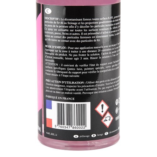 🇫🇷【 FABRIQUÉ EN France 】: Produit de qualité supérieure conçu et fabriqué en France, offrant un nettoyage fiable et performant Spray 500 Ml NeoClean IRON - Nettoyant Jantes & Carrosserie Décontaminant Ferreux, Décontaminant Ferre Nettoyant Jantes Indicateur Coloré Formulé avec un pH neutre, il est sans acide et non caustique, garantissant une utilisation sécuritaire même sur les jantes les plus délicates. Décontaminant Ferreux - ERM Ajoutez-le dès aujourd'hui à votre panier et découvrez la performance et l'excellence à chaque utilisation ! 💧【 PH NEUTRE ET SANS ACIDE 】: Nettoie en profondeur sans endommager vos jantes grâce à une formule non caustique et sécuritaire Workcar - Nettoyant Jantes pH Neutre - Décontainant Ferreux - Effet... - Qualité française : Fabriqué en France, ce produit incarne le savoir-faire et la qualité que vous attendez des produits professionnels., Conseils d'Utilisation : 1., Agitez bien le produit avant usage., 2., Pulvérisez généreusement sur les jantes et les surfaces contaminées., 3., Laissez agir jusqu'à ce que la couleur change en violet foncé (ne laissez pas sécher)., 4., Rincez abondamment à l'eau, de préférence sous haute pression, pour éliminer tous les résidus. Grâce à son indicateur de performance coloré, ce nettoyant change de couleur pendant son action, vous permettant de voir exactement quand le produit est prêt à être rincé pour un résultat optimal. 🎨【 INDICATEUR DE PERFORMANCE COLORÉ 】: Le produit change de couleur pour indiquer son action en cours, garantissant un nettoyage efficace et complet Test du VALETPRO Dragon Breath Nettoyant jantes Décontaminant ferreux - Utilisation polyvalente : Compatible avec différents types de jantes, y compris celles équipées de systèmes ABS. ✅【 COMPATIBLE ABS 】: Formulé pour être utilisé en toute sécurité sur les jantes modernes, y compris celles équipées de systèmes ABS