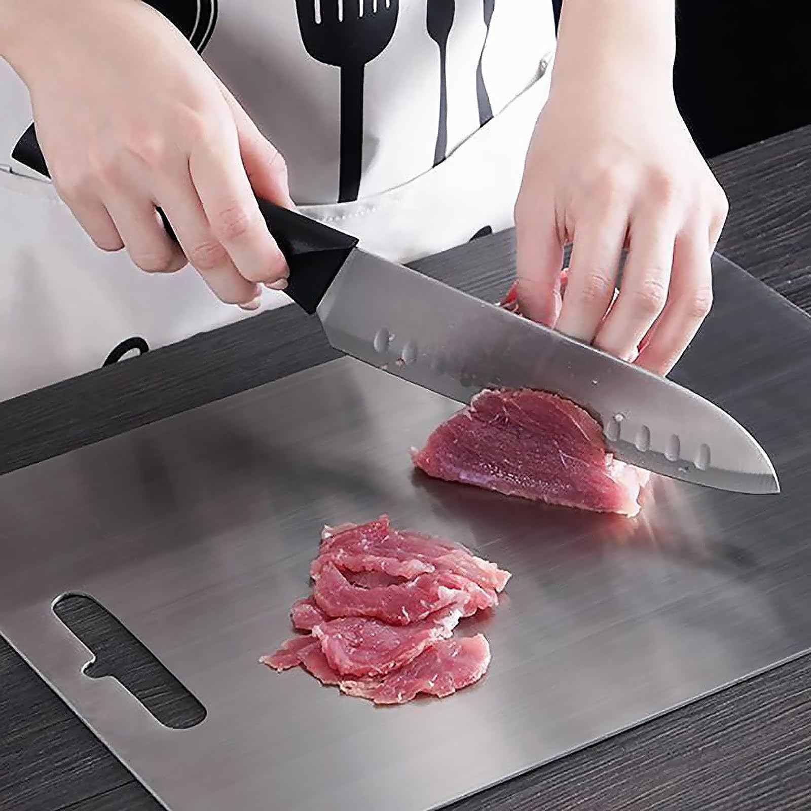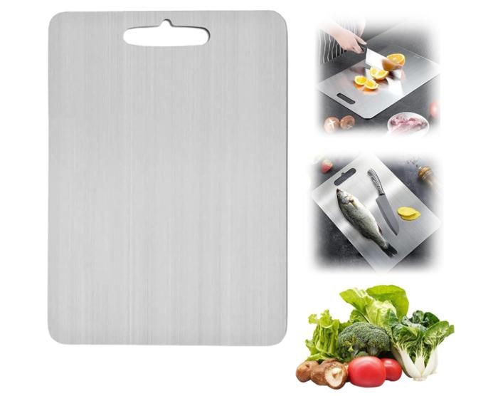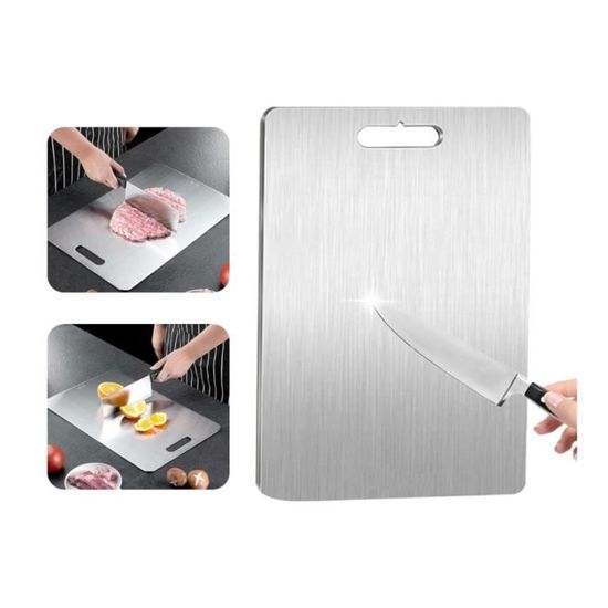 Acier Inoxydable 316 Alimentaire Keboyoe Planches à Découper Facile à Nettoyer: Planche à découper en acier inoxydable ne colle pas aux aliments, n'absorbe pas les liquides et peut être nettoyée à l'eau. Planche à Découper Qaestuan En Titane, En Inox Planche à Découper Inox Disponible sur les Deux Faces: La planche a découper en titane est traitée par brossage sur les deux faces. Disponible sur les Deux Faces: La planche a découper en titane est traitée par brossage sur les deux faces. Le recto est utilisé pour couper les légumes et le verso pour couper la viande, ce qui réduit la prolifération des bactéries Planche à découper en titane de haute qualité. Fabriqué en titane solide de 1,2 mm d'épaisseur, il est assez solide pour résister à des couteaux lourds... La planche a decouper en titane n'affecte pas le tranchant des couteaux, ce qui est idéal pour réaliser une grande variété de préparations culinaires. Elle ne dégage pas d'odeur, même après une longue période d'utilisation. La nouvelle planche à découper en titane multifonction est parfaite pour offrir à la famille et aux amis qui aiment la cuisine Hen. Comparée aux planches à découper en plastique et en bois, la planche à découper titanene produit pas de produits chimiques ni de débris. Facile à Utiliser: Planche a decouper inox est antidérapante, les aliments ne glissent pas facilement, ce qui permet d'améliorer l'efficacité du travail. Spécifications:Matériau: SUS 304Taille: 30x19,5 cm/11,81x7,68 inPoids: 384 gUtilisation: pour couper la viande, les fruits et les légumesInclus:1 x Planche a decouper en titaneRemarque:1., En raison de l'effet de lumière, la couleur réelle peut être légèrement différente de l'image., 2., En raison des mesures manuelles, il faut prévoir un écart de 0,1 à 0,3 cm.