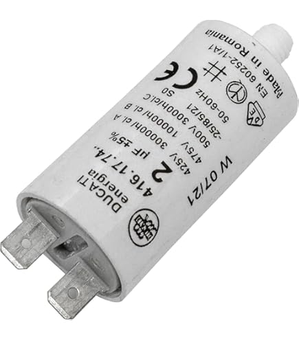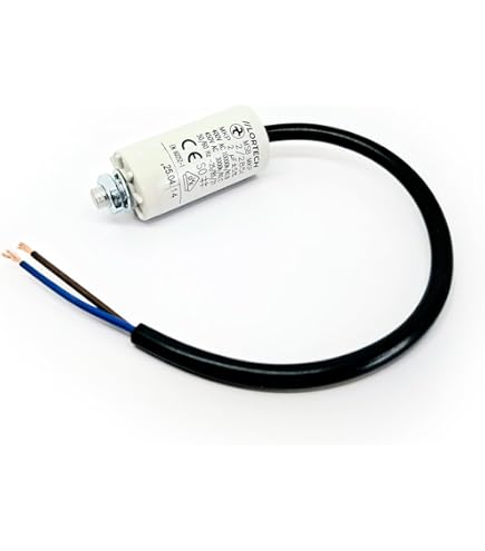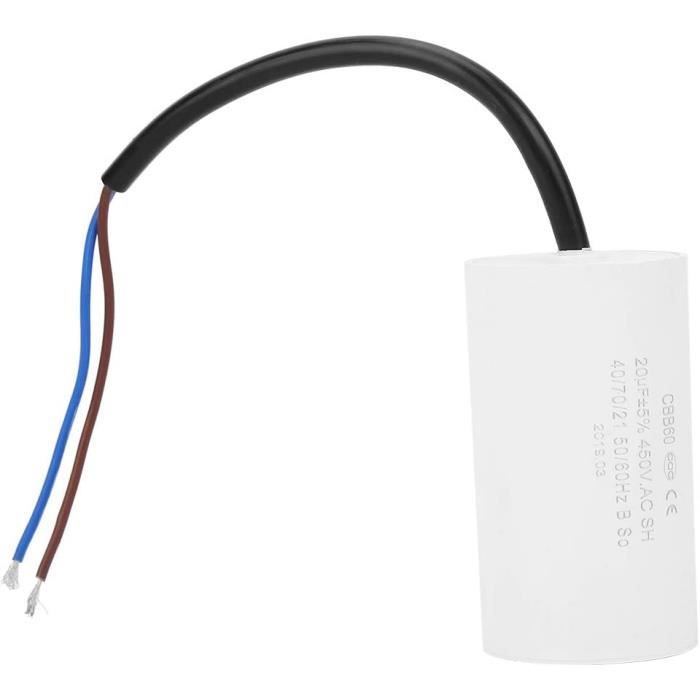 Pièce électrique Tondeuse Pompe Condensateur 2uF/2µF Démarrage / Permanent Pour Moteur, Avec Gaine Et Fils Dénudés Condensateur De Demarrage Condensateur CBB65 2uF 450V métal 2 bornes moteur électrique démarrage... CONDENSATEUR 2µF A CABLE - 25x48 mm HAUTES PERFORMANCES: Le condensateur de moteur a une capacité de 2µF ±5% et est conçu pour des tensions allant jusqu'à 450VAC (50/60Hz). Condensateur 2uF/2µF démarrage / permanent pour moteur, avec gaine et fils dénudés ; Durée de vie 10000h ; Température de fonctionnement -25 à 85... Grâce à sa large plage de température de -25°C à 70°C, le condensateur peut également être utilisé dans des environnements difficiles. INSTALLATION FACILE: Le raccordement indépendant de la polarité permet un montage rapide et sans erreur. Le boulon de raccordement M8x10 situé sur la face inférieure permet de fixer le condensateur facilement et en toute sécurité dans votre application. Type De Condensateur: Condensateur MoteurType De Conception: RadialCapacité: 2µFTension AC: 450VTolérance: ±5%Température: 70°CLien: Fil 25cmHauteur: 55mmDiamètre: 26mmEnveloppe: Boîtier En PlastiqueBoulon: M8x10mm