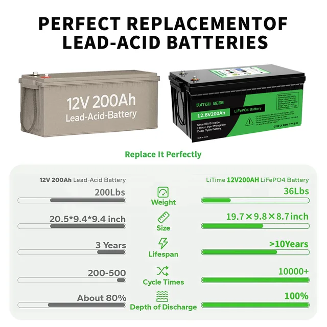 BMS 200 A intégré : la batterie DATOUBOSS LiFePO4 200 Ah dispose d'un BMS intégré de 200 A pour protéger la batterie contre les surcharges, les surdécharges, les surintensités et les courts-circuits avec un excellent faible taux d'auto-décharge. 12V 200AH LiFePo4 Batterie Lithium Eisen Phosphat Batterien Bulit in BMS Akku Für Auto Boot Idéal pour la marine, le camping-car, la caravane, la batterie de voiture et les applications de stockage d'énergie hors réseau Stockage Energie Solaire DATOUBOSS Batterie 12V 200Ah LiFePO4, Batterie Lithium Avec BMS 200A, 4000-15000 Cycles Profondes, 2560Wh Energie, Prise En Charge En Connexion Série/Parallèle, Pour Camping-Car, Système Solaire Batterie Lithium Cycle Profond Camping-car Cette batterie est parfaitement étanche à la poussière et résiste à l’injection d’eau à basse pression sous tous les angles. C'est pourquoi notre batterie LiFePO4 est le remplacement parfait de la batterie au plomb-acide, adaptée pour les camping-cars, les bateaux, la maison ou les systèmes solaires hors réseau, et est plus pratique et conviviale pour les différents scénarios d'utilisation des utilisateurs. DATOUBOSS 12 V 300 Ah LiFePO4 Battery Integrated 200 A BMS 15000 Cycles Deep Cycle Lithium Battery Max 3840 W Power Support In Series/Parallel... N'hésitez pas à nous contacter si vous avez des problèmes liés au produit, nous avons un service après-vente doux et patient. Basé sur la profondeur de décharge et la durée de vie, une batterie DATOUBOSS 12 V 200 Ah = deux batteries plomb-acide de 12 V 200 Ah, ce qui signifie qu'il coûte 6 batteries plomb-acide pendant 10 ans, et le coût total est 2 fois supérieur aux batteries LiFePO4., Technologie avancée Lithium Iron : la batterie Lifepo4 de 200 Ah utilise des cellules de grade A avec une densité d'énergie plus élevée, des performances plus stables et plus de puissance. Par conséquent, notre batterie LiFePO4 est le remplacement parfait de la batterie plomb-acide, adapté aux camping-cars, bateaux, maisons ou systèmes solaires hors-réseau, et est plus pratique et convivial pour les différents scénarios d'utilisation des utilisateurs. PROTECTION BMS COMPLÈTE La batterie au lithium 12 V 200 Ah peut atteindre 100 % de profondeur de décharge, tandis que l'acide plomb n'atteint que 50 %. 【4 x durée de vie et 2 x ratio de prix de performance】 La durée de vie de la batterie DATOUBOSS LiFePO4 est de 10 ans, tandis que l'acide plomb est de 3 ans. La batterie Lifepo4 a une excellente performance de cycle, une charge et une décharge rapides, une profondeur de décharge à 100 % et une puissance de sortie élevée. Étanchéité IP65 des batteries La batterie lithium-ion LiFePO4 peut être utilisée en toute sécurité dans de nombreux domaines : alimentation de secours, système de stockage d'énergie domestique, éclairage, moteur trolling, détecteur de poissons, scooter électrique, tondeuse à gazon, chariot de golf, bateau, système solaire, routeur 12 V, sauvegarde UPS, camping-car et plus encore.