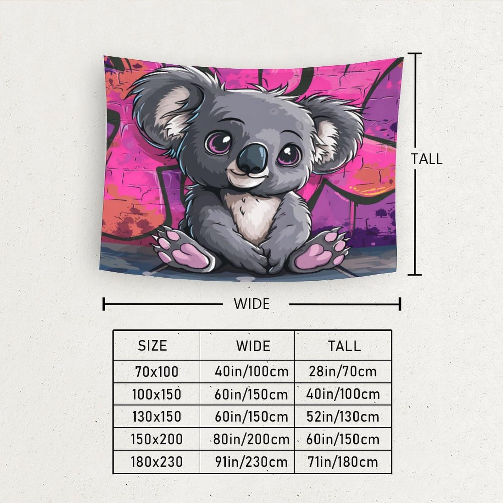 - les couleurs sont voyantes et belles, ne se fanent pas et sont faciles à nettoyer. [conseils d'entretien]: Veuillez utiliser de l'eau froide et un détergent doux pour nettoyer afin de prolonger la durée de vie. Nous offrons également un paquet d'accessoires de suspension comprenant: 2 clips avec des barbes et 3 crochets à clous non marqués, il suffit de fixer l'extrémité de la couverture murale au mur pour une installation facile et sans endommager le mur. - convient pour la décoration de la maison, la décoration de dortoir, la décoration de studio, etc. KKOLASXZE Le Rainbow 3D Effet Tapisserie DécoSourision Murale Contenu de l'emballage 1 x tapisserie 1 paquet d'accessoires de suspension Il peut aussi être un bon cadeau pour un ami. C'est une belle tapisserie faite de matériaux décoratifs durables. L'extérieur est magnifiquement conçu, ce qui en fait une décoration idéale pour le salon... peut être offert comme cadeau à la famille et aux amis. L'extérieur est magnifiquement conçu, ce qui en fait une décoration idéale pour le salon, la chambre à coucher, le Bureau. [Taille parfaite]: 70cm x 100cm, 100cm x 150CM, 130cm x 150CM, 150CM x 200cm, 180cm X 230cm, plusieurs tailles pour vos murs! Décoration Mur Tissu Polyester Impression HD NQHXLRUDC Koala 3D Effet Tapisserie DécoSourision Murale Tapisserie Murales DécoSourision Murale En Tissu Pour Chambre Salon Serviette De Plage Tapisseries 130cmx150cm Décoration Chambre 3D Décoration élégante et multi-usage]Notre papier peint panoramique 3D effet transforme instantanément votre intérieur en apportant caractère et style [Multi - usage] Cette décoration de chambre esthétique peut être utilisée non seulement comme décoration murale, mais aussi comme nappe, décoration murale, décoration de dortoir, draps de pique - nique, châles de plage, écharpes, couvertures, housses de canapé, etc.