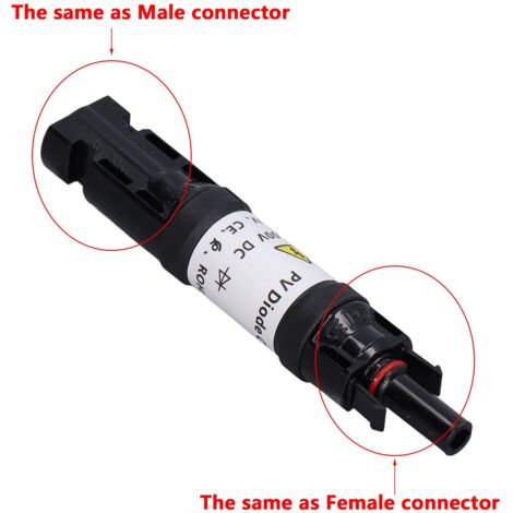Connecteur Mâle Femelle Solaire DEWIN Connecteur Fusible Photovoltaïque,Connecteur De Diode Matériau PPO Haute Sécurité Isolation Lot De 2 De Connecteur PV Solaire 1000 V Diode Anti-retour Étanche à l'eau et à la poussière Le connecteur de diode PV solaire adopte une conception d'anneau étanche à haute résistance, qui a de bonnes performances... Plage de température de fonctionnement : -40℃~+90℃ Diamètre du fil d'adaptation : 2,5-6,0 mm² Liste des paquets 1 * Connecteur de diode solaire PV Spécification Matériau : PPO + cuivre Utilisation : connecteur de protection contre la foudre Couleur : noir Tension nominale : 1 000 V CC Tension d'essai : 6 000 V (50 Hz, 1 min) Résistance de contact du connecteur : ≤ 0,5 mΩ Matériau du conducteur du connecteur : cuivre étamé Niveau de protection : IP2xIP67 Indice de résistance au feu : UL94-VO Fonction d'isolation du guide La tête de contact du trou du connecteur à diode est équipée d'un élément d'isolation de guidage, qui joue le rôle d'isolation de guidage et améliore les performances de sécurité. 【Double Protection】: Connecteur de Diode PV solaire mâle femelle Il peut être transporté et déconnecté avec des charges, double poids sans choc électrique, qui peut répondre aux liaisons rapides et aux fonctions sans vibration. Courant de notation: 10A/15A/20A/30A (facultatif). 【Excellentes performances électriques】: Diode connecteur de panneau solaire Fabriqué en matériaux PPO à haute qualité, qui a une rigidité élevée, une résistance à la chaleur élevée, un ignifuge, une forte longueur et une excellente performance électrique. Double Protection Connecteur de Diode PV solaire m le femelle Il peut tre transport et d connect avec des charges, double poids sans choc lectrique, qui peut r pondre aux liaisons rapides et aux fonctions sans vibration