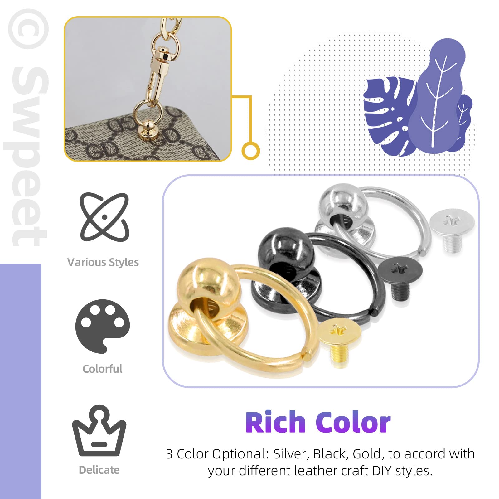 Swpeet Lot de 123 rivets à tête ronde à vis de 8 mm - 3/10 avec anneau torique et tournevis avec kit d'alêne Pourquoi nous choisir ? Facile à utiliser. Remarque : veuillez mettre un tapis pour protéger la table., Installation : 2., Alignez la position et tapotez l'extrémité du poinçon avec un marteau jusqu'à ce que le trou soit terminé., Configuration : 3., Alignez la vis avec le trou perforé et mettez-la dedans., Configuration : 4., Enfin, serrez la vis avec un anneau en D, des pieds de sac à main, des vis Chicago, etc., Le tour est joué. Ils donnent à une pièce une véritable sensation industrielle. Les têtes de bague conçues sont si géniales dans un morceau de cuir épais. Contenu : dans ce kit, vous recevrez 123 rivets à tête ronde à vis de 3 couleurs de 8 mm à 3/10 avec clous à anneau torique et tournevis avec kit d'alêne, y compris 120 rivets à tête ronde à vis de 3 couleurs avec clous à anneau O et vis assorties, 2 tournevis, 1 poinçon. Total de 123 pièces. Bricolage Cuir DEX Goujons De Rivets à Tête Ronde 80 Pièces Rivets En Cuir 4 Couleurs Rivet à Tête Ronde Fileté Rivets Chicago Anneaux Toriques Rivets à tête ronde Rivet champignon - HURRISE - 100 ensembles - Blanc Mode d'emploi : Installation : 1., La tête du trou est pointue vers le produit ; placez le poinçon à 90 degrés là où le produit doit être perforé. Achetez-les dans votre sac. Les rivets en laiton sont durables pour une utilisation à long terme. Multifonction : ces rivets à vis sont adaptés pour la fabrication, la réparation et la décoration de produits en cuir. Ils peuvent améliorer l'esthétique et la... Rendez votre projet plus beau et unique., 4., Gagnez du temps. Vous serez heureux que les vis à tête plate en laiton soient assez discrètes. Matériau durable : ces rivets en laiton en D pour sac à main, clous à bille, clous Chicago sont fabriqués en laiton de haute qualité avec une forte résistance à l'usure et à la corrosion, excellente qualité, pieds à tête plate en métal doré ne se décolorent pas facilement, ne s'oxydent pas et ne rouillent pas. Lot De 10 Rivets À Tête Ronde En Cuir Doré 8 X 5 Mm[H7298... Vous pouvez coudre le cuir ou le tissu résistant sans effort. Idéal pour décorer vos sacs, ceintures, bracelets en cuir, chaussures, bottes, sacs à main, chapeaux et bien plus encore. Convient pour tous les types d'art et de maroquinerie et de fabrication de vêtements, se visse bien et fonctionne parfaitement avec des sangles en cuir., Qualité supérieure.