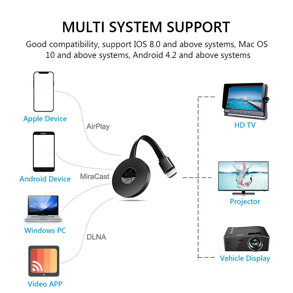 L'utilisation polyvalente fait de l'adaptateur un compagnon idéal pour le home cinéma, l'école, les réunions ou les voyages. MiraScreen G2 Dongle HDMI Sans Fil – Diffusez Votre Écran en HD 1080P... 【1080P Full HD & Affichage Clair】Ce dongle HDMI sans fil fournit des images nettes et prend en charge le décodage 4K pour une qualité impressionnante. Avec l'adaptateur airplay intégré, vous pouvez diffuser du contenu directement depuis l'iPhone ou l'iPad. Hdmi Bluetooth NipMiracast-Clé TV Sans Fil Compatible HDMI, Adaptateur D'affichage à écran Miroir HD 1080P, Dongle TV Wi-Fi, Compatible Avec IOS Et Android Miroir écran Smartphone Tv S'adapte à tous les appareils compatibles HDMI tels que TV, projecteur ou moniteur et les transforme en écrans multimédias sans fil. Dongle HDMI sans fil Streaming Miracast HDMI Dongle sans fil Display Adaptateur HDMI Cast Dongle pour i Phone i Pad Android iOS Windows Mac PC TV Moniteur Projecteur / Miracast DLNA Airplay Le dongle HDMI sans fil est la solution idéale pour transférer sans fil du contenu de votre smartphone, tablette ou ordinateur portable vers de grands écrans. Compatible avec de nombreux appareils : le dongle Miracast fonctionne avec Android, iOS, Windows et macOS. Connexion Wi-Fi stable : avec double bande 2., 4G/5G et antenne, l'adaptateur Bluetooth HDMI assure un transfert de données fluide sans retard. Parfait pour les présentations, les films, les émissions sportives et le streaming en direct sans interruption. Il suffit de brancher le dongle HDMI dans le port HDMI de votre téléviseur, moniteur ou projecteur, de brancher USB et de le connecter sans fil, sans application ni pilote. La mise en miroir ou l'extension de l'écran sont possibles: mettez en miroir des photos et des vidéos ou étendez l'écran pour des présentations professionnelles. Idéal pour visionner des vidéos, des photos, ou pour jouer à des jeux sur grand écran, le Miracast dongle offre une expérience immersive. Facile à installer et à utiliser, il est compatible avec la plupart des appareils et constitue un excellent complément pour votre équipement multimédia Le dongle Miracast est universellement compatible avec Android, iOS, Windows et MacOS et prend en charge Miracast, AirPlay et DLNA. Le dongle HDMI Miracast est parfait pour les présentations de bureau, l'enseignement, le divertissement à domicile ou comme compagnon de voyage pour le streaming mobile. MiraScreen G2 Dongle HDMI Sans Fil – Diffusez Votre Écran en HD 1080P