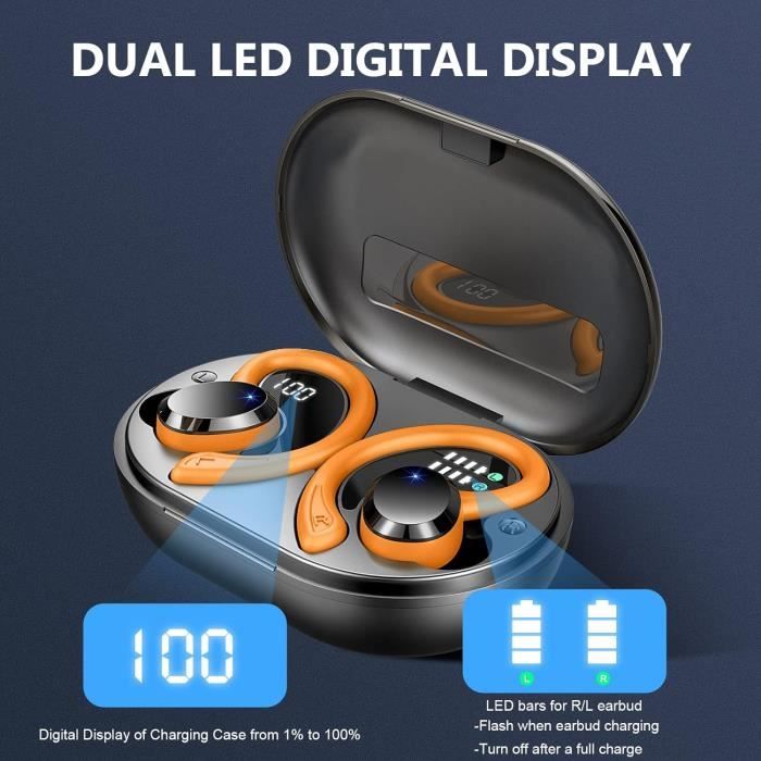 Casque Audio Sans Fil Sport DUSONLAP Écouteurs Open Ear De plus, les ecouteurs sans fil bénéficient d'une étanchéité IPX7, leur permettant de résister à la sueur et à la pluie lors d'une utilisation quotidienne. Oreillettes Sans Fil IPX7 étanche DUSONLAP Ecouteurs Bluetooth Sans Fil, Open Ear Oreillette écouteurs Filaire Cela garantit un port agréable même lors d'une utilisation prolongée. Affichage Numérique LED et Batterie Longue: Les ecouteurs bluetooth sans fil sport disposent d'un écran LED, permettant de visualiser avec précision le niveau de batterie restant du boîtier, vous permettant ainsi de profiter de chaque instant sans soucis, très approprié voyages sportifs et aptitude Conception de port ouvert et Étanchéité IPX7: Ecouteurs bluetooth sans fil grâce au design open-ear, accompagnés de crochets d'oreille en silicone souple... Affichage Numérique LED et Batterie Longue: Les ecouteurs bluetooth sans fil sport disposent d'un écran LED, permettant de visualiser avec précision le niveau de batterie restant du boîtier, vous permettant ainsi de profiter de chaque instant sans soucis, très approprié voyages sportifs et aptitude. Réduction du bruit ENC et Qualité Sonore Supérieure: Les ecouteurs bluetooth sont équipés de la technologie de suppression du bruit environnemental (ENC) et microphones haute définition, qui peuvent réduire 80% du bruit de fond et présenter une expérience d'appel cristalline. Avec le toucher, vous pouvez facilement écouter de la musique, recevoir/rejeter/terminer des appels, l'assistant vocal du téléphone. Conception de port ouvert et Étanchéité IPX7: Ecouteurs bluetooth sans fil grâce au design open-ear, accompagnés de crochets d'oreille en silicone souple pour un maintien stable. écouteurs sport dotés de haut-parleurs de drivers surdimensionnés de 14., 2mm présente une gamme sonore puissante et large, pour vous offrir un son de qualité supérieure., Technologie Bluetooth 5., 4 Avancée et Couplage Facile: Les écouteurs bluetooth adopte la technologie bluetooth 5., 4 la plus avancée, la transmission du signal est plus rapide et plus stable, la distance de connexion stable peut atteindre jusqu'à 15 mètres. 1 HiFi Stéréo 2 Étanchéité IPX7 3 Largement compatible 4 Contrôle tactile