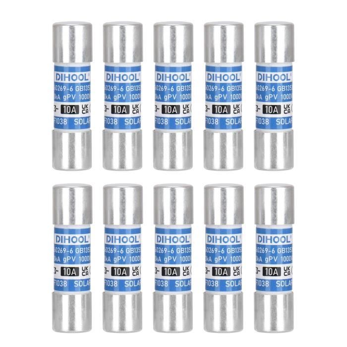 Pour une installation facile : chaque lot comprend un fusible CC et un support (poteau), installation pratique et sans tracas pour les panneaux solaires et les cordes CC. Type : 3 A, 10 A, 15 A, 20 A, 25 A, 30 A (en option). Caractéristiques d'isolation élevées : conçu avec des supercies d'isolation améliorées pour éviter les fuites électriques et assurer un fonctionnement sûr dans les circuits PV haute tension fonctionnant à 1000 VDC Pour fusibles PV pour panneaux solaires PV - 1000 V CC : ces fusibles sont spécialement conçus pour les cordes PV pour la protection et l'isolation, capables d'interrompre de faibles surintensités associées à des défauts pour les réseaux de cordes PV. Lot De 10 Fusibles Pv 10x38mm - 1000v Dc - 30a Haute Performance 5900280957870 Dimensions : 95 x 76 x 21 mm., Couleur : blanc. Plastiques haute résistance : le porte-fusible est fabriqué en plastique haute résistance, durabilité et sécurité dans les environnements difficiles. Un mini panneau solaire haute tension convertit la lumière laser en... Pour une installation facile : taille compacte de 95 x 76 x 21 mm dans un boîtier en plastique blanc permettant une intégration rapide dans les configurations solaires existantes avec un montage simple et aucun outil spécial n'est nécessaire Il peut être assorti avec des fusibles PV essentiels pour le panneau solaire pour la protection. Contenu de l'emballage : Fusible CC , Porte-fusible (poteau) , Remarque : , . Fusible Panneau Solaire Fusibles Pv 10 A Dc 1000 V 10 X 38 20 Ka Fusibles Haute Tension Tube De Protection String Pv La série de fusibles photovoltaïques (PV) HP10M de Mersen a été conçue spécialement pour la protection des câbles de raccordement PV pour les systèmes photovoltaïques industriels à 1000 VCC et les systèmes photovoltaïques des services publics. Sa construction robuste le rend idéal pour résister à des températures constantes et aux cycles de courant, augmentant ainsi la... Pour la protection PV : spécialement conçu pour les panneaux solaires PV et les configurations de cordes CC pour interrompre les faibles surintensités causées par des défauts, garantissant la stabilité du système et la sécurité des composants