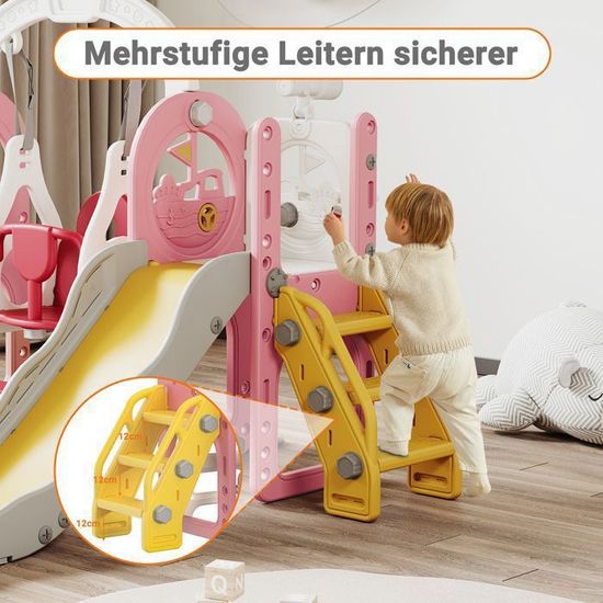 Avec des couleurs vives et ludiques, elle attire instantanément l’attention des enfants tout en s’intégrant facilement dans n’importe quel intérieur. Son charmant design en forme de bateau pirate crée une aire de jeu attrayante. Dimensions du produit : 150 x 150 x 115 cm, Matériau : PP/PEHD, Couleurs : rose, Poids net : 11 kg, Charge maximale : 35 kg, Assemblage requis : Oui Design Attrayant : La glissière 6 en 1 pour bébé se distingue par son apparence amusante de bateau pirate. Nombre de personnes recommandé : 2 DREAMADE Toboggan Enfant 6 en 1 Glisse de 140CM avec Escalade Panier de... Instructions d'Installation Claires : Accompagnée d'un guide d'installation détaillé et illustré, la glissière garantit un montage rapide et sans stress. Structure durable et stable ce toboggan est fabriqué à partir de matériaux de haute qualité et peut supporter jusqu'à 35 kg, garantissant ainsi la sécurité et l'aisance des parents pendant le jeu. Description du produit Découvrez le toboggan 6 en 1 pour bébé : le divertissement idéal pour vos enfants de 1 à 3 ans ! Structure PP/PEHD 35 Kg Max Toboggan Pour Enfants, Toboggan De 1 à 3 Ans, Toboggan Intérieur Et Toboggan Exterieur Enfant Toboggan pour enfant 5 en 1 pour l'intérieur et l'extérieur à partir de... Ce système permet de gagner de l’espace dans la maison, tout en rendant le transport simple pour les sorties. Structure Durable et Stable : Fabriquée avec des matériaux de haute qualité, cette glissière est conçue pour durer. Avec des éléments comme le télescope et le panier de basket, ils stimulent leur imagination tout en développant leurs compétences motrices, rendant chaque moment de jeu précieux et engageant. Chaque étape est clairement indiquée, permettant aux parents d’installer facilement l’aire de jeu. Toboggan pour enfants - Toboggan multifonction 5 en 1, adapté aux Capable de supporter jusqu’à 35 kg, elle offre une sécurité maximale pendant les jeux, procurant ainsi aux parents la tranquillité d’esprit. Design élégant Ce toboggan 6-en-1, au design amusant de bateau pirate et aux couleurs vives, captive instantanément l’attention des enfants et s’intègre facilement à tout espace intérieur ou extérieur. Amusement illimité Conçu pour le plaisir, cet espace de jeu permet aux enfants de glisser, de se balancer, de grimper et d’explorer, développant ainsi leur motricité tout en s’amusant pendant des heures. Dimensions du produit : 150 x 150 x 115 cm, Matériau : PP/PEHD, Couleurs : bleu, Poids net : 11 kg, Charge maximale : 35 kg, Assemblage requis : Oui