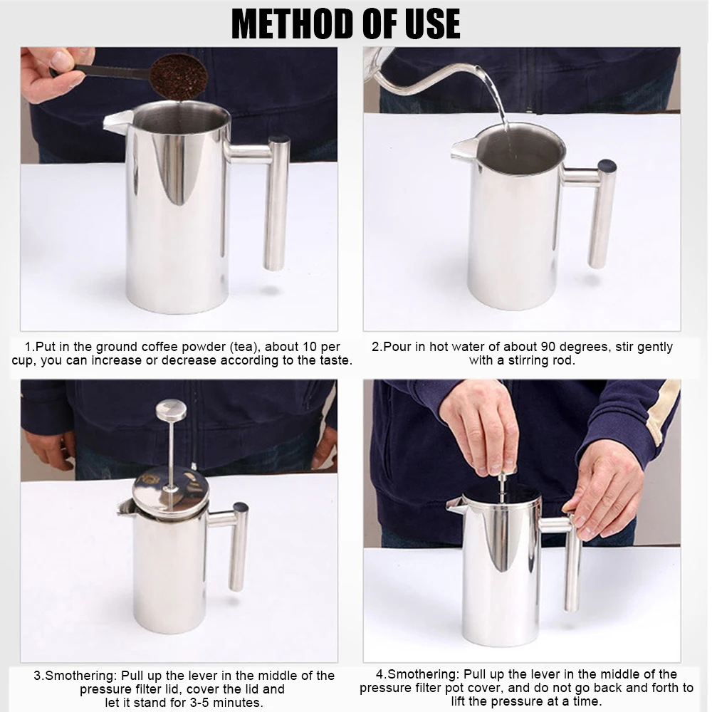 Facile à Nettoyer Lave-vaisselle Cafetière à Piston INOX, Français Presse Café Isolation à Double Paroi De 1 L, Paroi Intérieure Avec Cautèle, Avec 5 Filtres à Café Et Cuillère Doseuse, 7-8 Tasses, Noir Mat, Café, Thé Cafetière Camping Voyage Faites l'expérience du nec plus ultra en matière de préparation de café avec notre cafetière à piston en acier inoxydable. Conçu dans un souci de durabilité, cet appareil durable offre des avantages économiques. La structure du filtre en acier inoxydable garantit qu'aucun marc de café ne pénètre dans votre tasse, ce qui donne une saveur délicieuse et corsée. Avec sa construction... Cafetière À Piston, Pot De Presse Française En Acier Inoxydable 304 Utilisation : peut non seulement faire du thé, mais aussi du café, de la mousse de lait, etc. Cafetière à piston de camping en acier inoxydable double couche portable pour la maison, l'extérieur, le camping, les voyages (800 ml) · 350 ml. $33.49$33.49. In... Facile à nettoyer : la presse française à double paroi est facile à nettoyer au lave-vaisselle, légère, grande capacité, résistance aux hautes températures, pas facile à endommager. Triple pression de filtration : cafetière en acier inoxydable triple pression de filtration fine, cafetière de cuisinière filtre plus en profondeur, rendant le café délicat et parfumé. Double isolation : presse à café française double isolation thermique creuse, isolation efficace de la presse française de voyage, chaleur et froid jusqu'à 1 heure, pas les mains chaudes. Spécification : Triple pression de filtration : triple pression de filtration fine de la cafetière en acier inoxydable, filtre plus approfondi de la cafetière pour cuisinière, rendant le café délicat et parfuméDouble isolation : presse à café française double isolation thermique creuse, isolation efficace de la presse française de voyage, chaleur et froid jusqu'à 1 heure, pas les mains chaudesUtilisation : peut non seulement faire du thé, mais aussi du café, de la mousse de lait, etc.