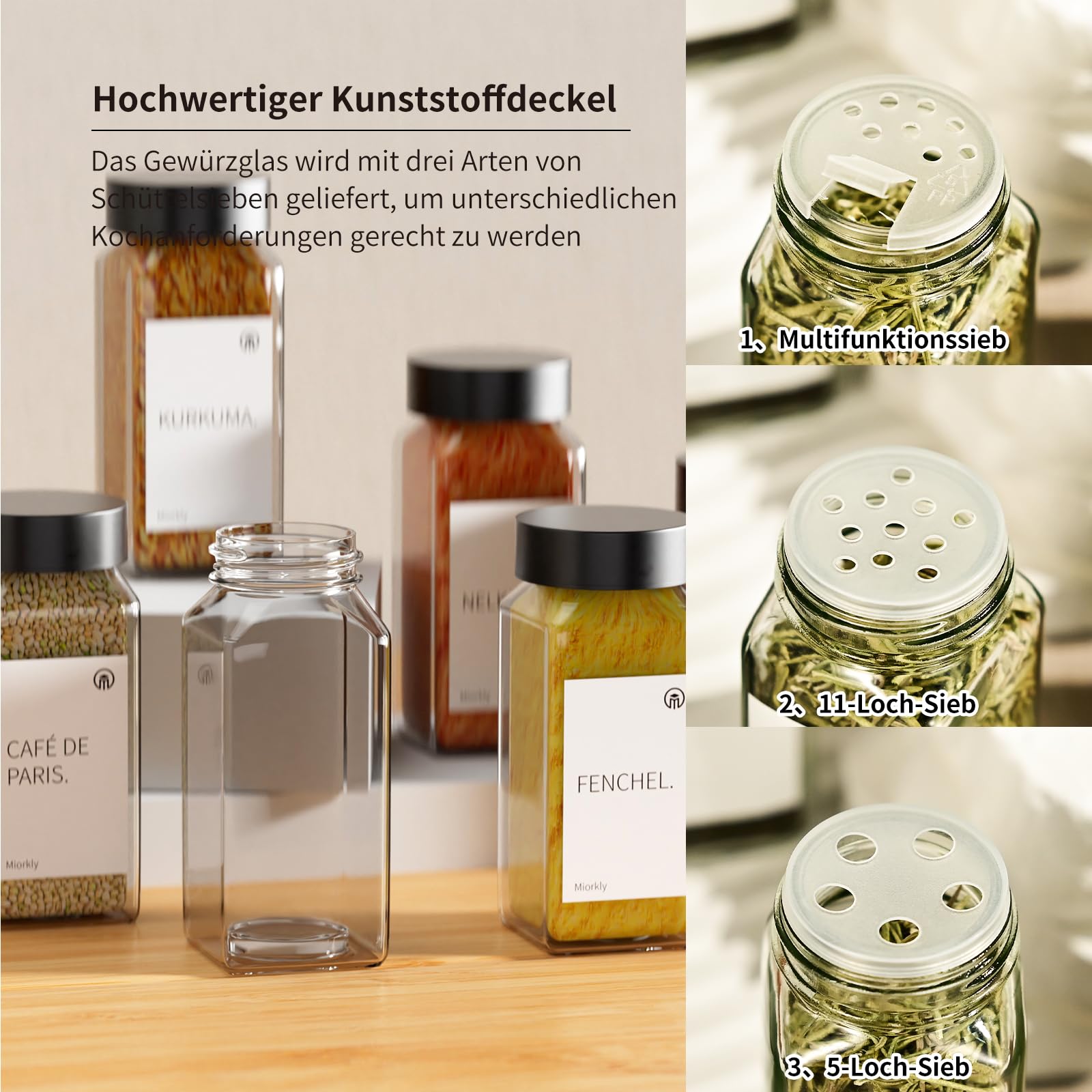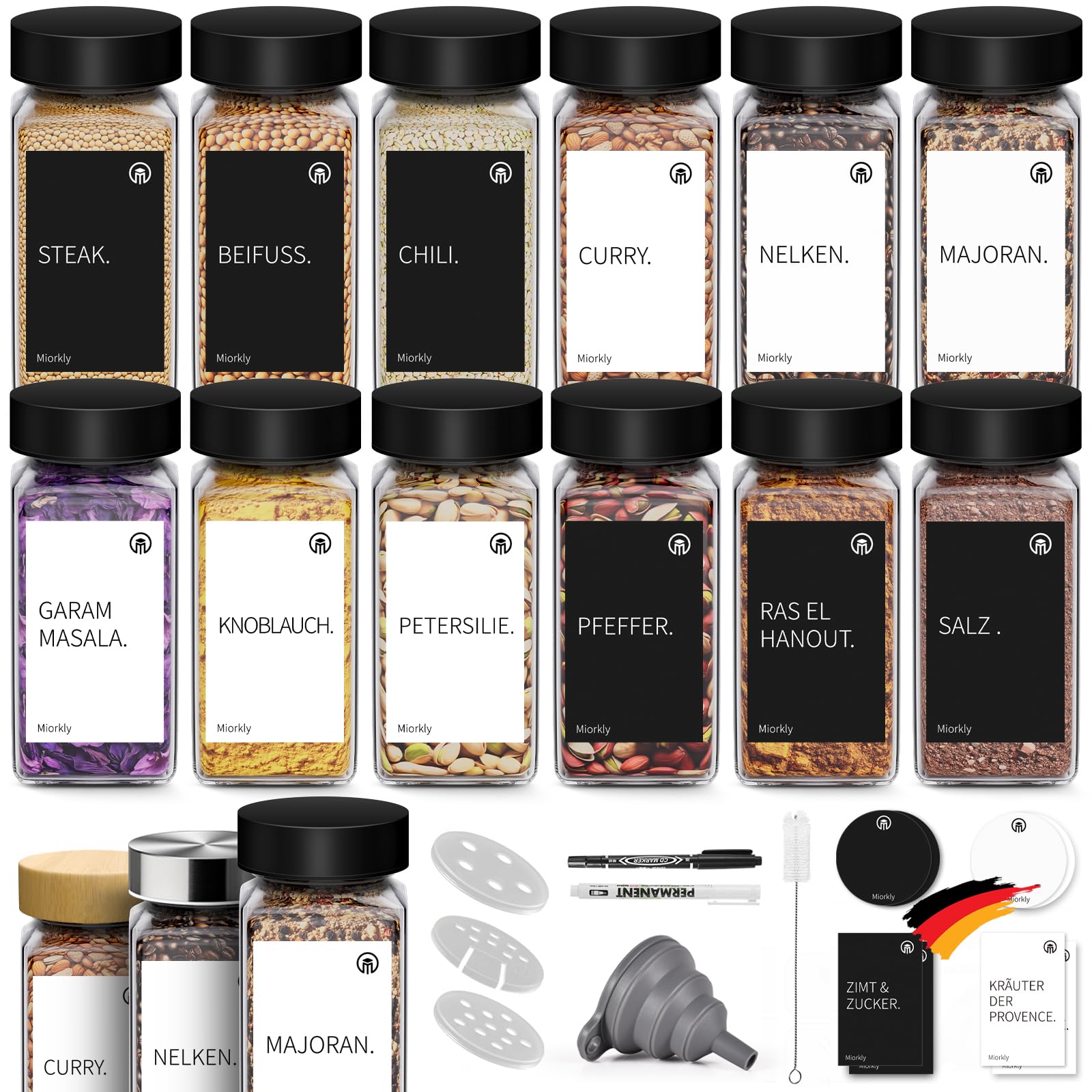 Pots épices 120 Ml Avec Saupoudreur Miorkly Lot De 12 Pots à épices Carrés Avec Couvercle En Acier Rangement épices Hermétique Qualité Alimentaire Si vous recherchez un moyen pratique et organisé de stocker vos herbes, ces pots à herbes sont la solution idéale. Commandez-les maintenant et profitez de la fraîcheur et de la commodité dans votre cuisine HEYNNA Lot de 12 Pots à épices avec Bouchon de liège de Haute qualité Avec le tamis perforé à double usage, vous pouvez contrôler la quantité d'utilisation et la taille des épices. Pot à épices : 10,5 x 4,5 cm. Contenu : Pots de rangement de 120 ml avec couvercles en acier inoxydable - 12 étiquettes rondes à épices - 24 stylos... Le lot de boîtes à épices peut répondre à vos besoins de stockage et d'utilisation de la plupart des épices Excellente conservation des épices : le récipient à épices est fabriqué uniquement à partir de matériaux de haute qualité, ne contient pas de substances nocives, a les propriétés de résistance à l'usure, de résistance à la corrosion et est facile à nettoyer. Large gamme d'applications : les pots à épices carrés peuvent être ajoutés à des épices grossières et fines, de la cannelle, du sésame, de la poudre de muscade et de curry, etc. Organisateur d'épices parfait : le corps des boîtes à épices en verre peut déterminer avec précision la quantité restante d'épices [Le couvercle noir est muni d'un film de protection qui doit être retiré lors de l'utilisation] Le bouchon de la bouteille en acier inoxydable de qualité supérieure + plastique de qualité alimentaire peut former une excellente étanchéité qui préserve le parfum et le goût d'origine des épices pendant une longue période