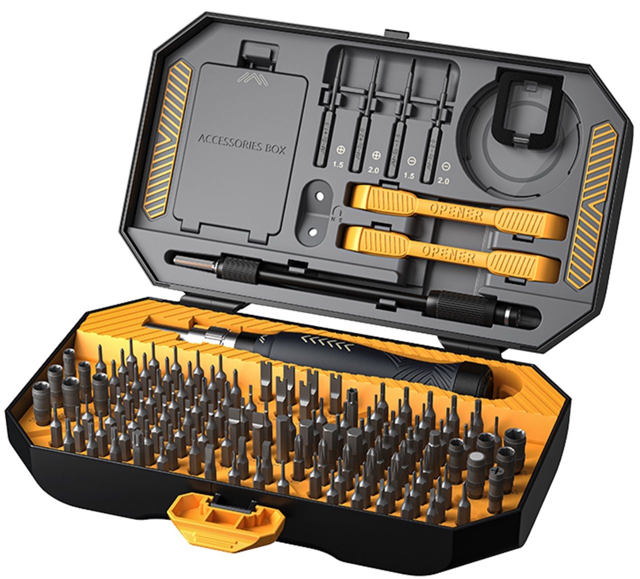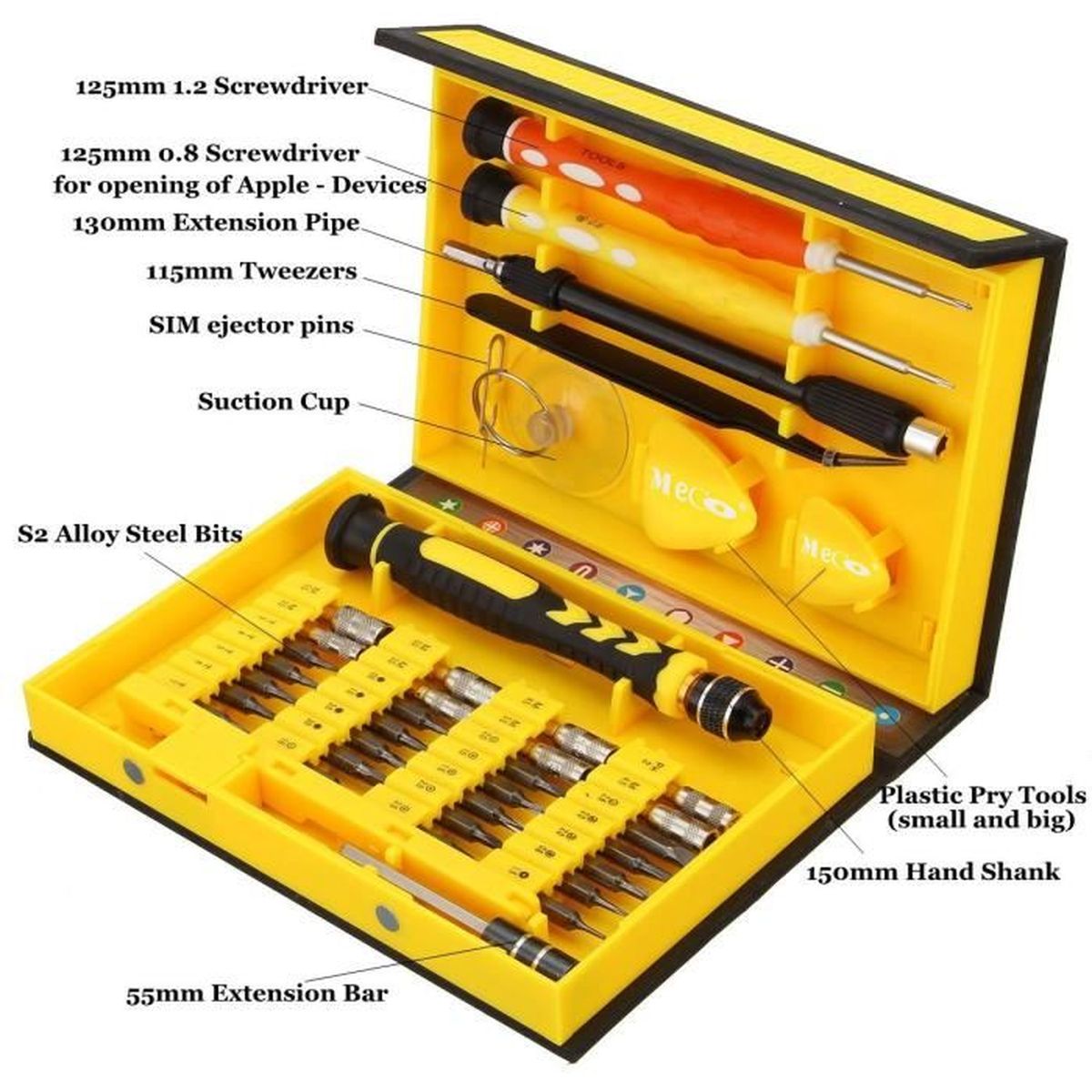 Outil multifonctionnel 25 en 1 Le jeu de tournevis de précision MMOBIEL 25 en 1 est un kit compact de haute qualité avec une solide pochette en cuir. Ce jeu de tournevis de précision MMOBIEL 25 en 1 est idéal pour les réparations d'appareils tels que: - iPhone; - iPad; - les Smartphones Samsung; - les tablettes Samsung; - Smartphones (HTC/Oneplus/Oppo/Google/Xiaomi/Huawei/LG/SONY); - PS4/XBOX One/Nintendo Switch/PS Vita/PSP/3DS et autres consoles de jeux; - Réparation d'appareils photo tels que : Canon/Nikon/SONY/Polaroid/GoPro/SJCAM; - Réparation de lunettes; Ce kit contient tous l'outillage comme indiqué sur les photos 1 x Tournevis à poignée MMOBIEL Set de 24 Tournevis Professionnels + Ruban adhésif 2mm Le manche est fabriqué en aluminium de haute qualité qui est confortable à tenir et facile à utiliser. 1 x Y (Tournevis en Y) (2., 0) pour iPhone, 1 x Tournevis triangulaire (2., 3), 1 x Tournevis à pointe (0., 8) OBIEL Set de 24 Tournevis Professionnels Ruban adhésif 2... Produits de qualités professionnelle! 2 x tournevis du Pentagone (0,8/1,2) Facile à utiliser 24 embouts sont inclus dans différentes formes et tailles pour presque tous les travaux et chaque embout s'adapte parfaitement à la solide poignée en aluminium. Set Outils Mini électronique MMOBIEL OBIEL Set De 12 Tournevis Agnétiques Pour Réparations électronique Tournevis Facom 30pcs Kit d'outils de réparation de téléphone, Professionnel Jeu de... La trousse de 25 outils permettant d’ouvrir et réparer tous types de dispositifs en toute sécurité