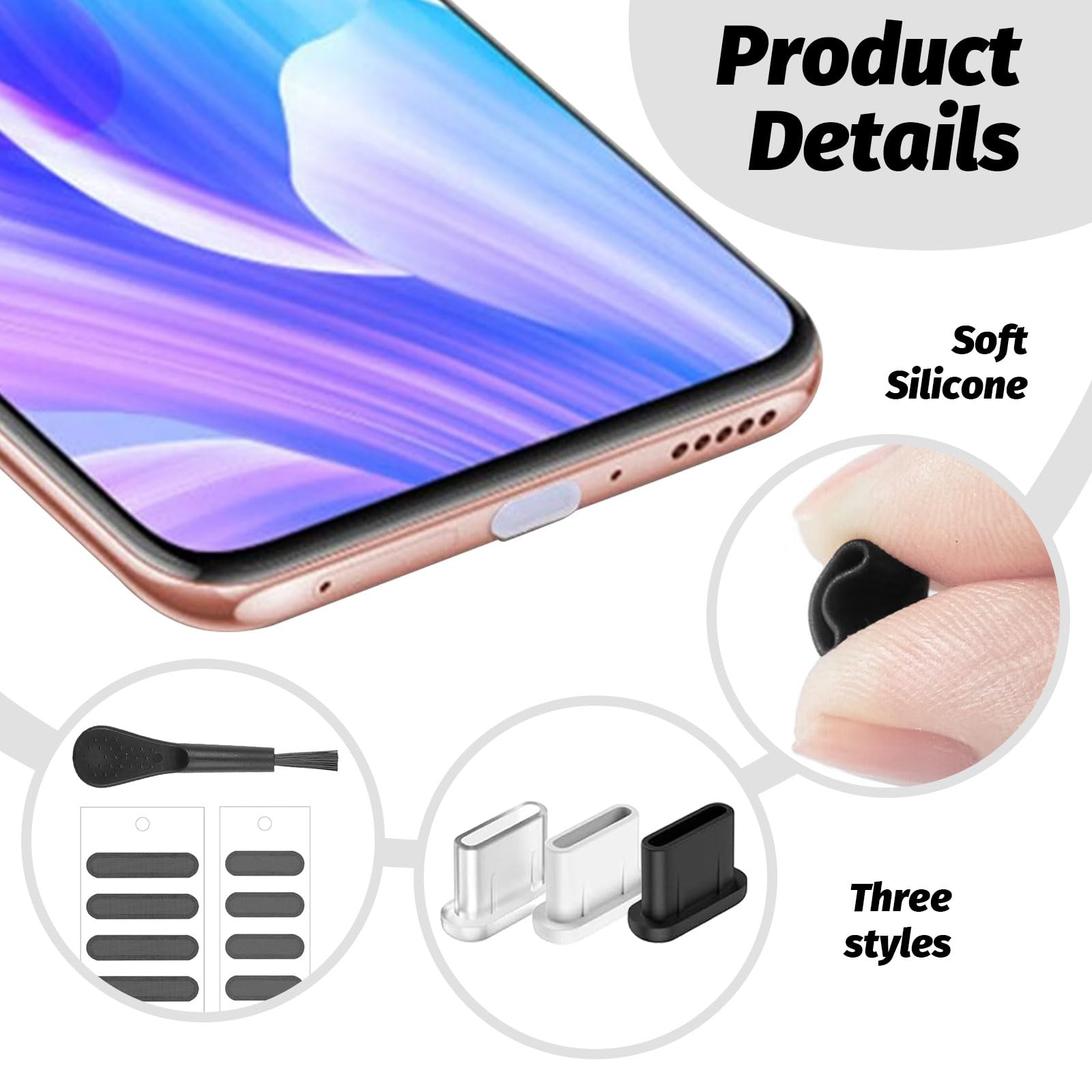 3-16pack bouchon anti-poussière fileté par valve de joug de réservoir de plongée sous-marine Pour retirer le bouchon de protection ou le capuchon du haut-parleur, utilisez vos ongles ou une pince à épiler Brouilleur De Telephone Portable LunarCharm Ensemble De 19 Pièces Bouchon Anti-poussière USB C Et Bouchons USB-C Silicone IPhone 15 Pro Les deux sont conçus pour fonctionner avec des coques de téléphone sans nécessiter de retrait Le kit inclut 8 bouchons (2 types) une brosse de nettoyage. Tu nettoies le port avec la brosse, tu clipes le bouchon - ça tient même avec une coque. Pour... 3-16pack bouchon anti-poussière fileté par valve de joug de réservoir de plongée sous-marine... 【S'adapte parfaitement à l'appareil】 Les bouchons de port USB-C fabriqués avec expertise s'adaptent parfaitement au port de chargement de votre smartphone, offrant un design sécurisé, durable et léger qui assure un confort exceptionnel 【Couverture de haut-parleur insonorisée】 Cette couverture anti-poussière pour haut-parleur est faite de maille métallique fine améliorée pour protéger le haut-parleur de votre téléphone contre l'accumulation de poussière lors d'une utilisation prolongée. 【Contenu de la boîte】 15 bouchons anti-poussière pour USB C en silicone, 3 autocollants en maille anti-poussière et 1 brosse de nettoyage. 【Bouchon anti-poussière USB-C de haute qualité】 Notre ensemble de protection anti-poussière USB-C comprend deux types de couvertures. Elles contribuent grandement à prolonger la durée de vie du haut-parleur et à garantir une performance durable Les deux sont conçus pour fonctionner avec des coques de téléphone sans nécessiter de retrait2., 【Installation et désinstallation faciles】 Nettoyez la poussière avec une brosse, alignez le couvercle du connecteur USB-C ou du haut-parleur et appuyez facilement vers le bas.
