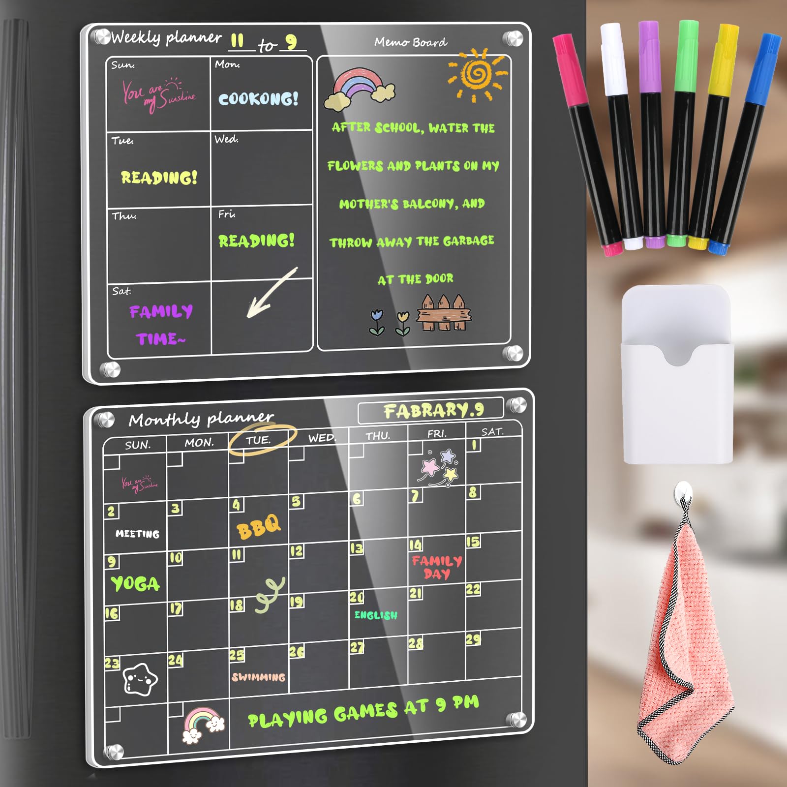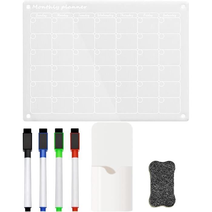 Il offre la solution idéale pour garder votre emploi du temps organisé. Planificateur Hebdomadaire Effaçable Lot De 2 Calendrier Magnetique Frigo,40x30cm Calendrier Acrylique Frigo Calendrier Frigo Effaçable Le planificateur hebdomadaire lavable vous permet de garder votre emploi du temps hebdomadaire clair et organisé. Vous pouvez compter sur votre agenda hebdomadaire pour rester sur place en toute sécurité et de manière fiable.Facile à écrire et à nettoyer La surface résistante aux taches du calendrier en acrylique transparent permet une écriture fluide et un effacement sans effort ◊【Facile à écrire et à nettoyer】 La surface résistante aux taches du calendrier en acrylique transparent permet une écriture fluide et un effacement sans effort. L'agenda hebdomadaire lavable conserve sa qualité et est réutilisable sans laisser de traces ni de taches. La surface en acrylique durable assure une écriture lisse et effaçable sans laisser de traces, gardant le tableau comme neuf. Avec une vue hebdomadaire et... Vous pouvez compter sur votre agenda hebdomadaire pour rester sur place en toute sécurité et de manière fiable. ◊【Fixation magnétique puissante sans perçage ni collage】 Doté d'aimants puissants et très épais, le planificateur hebdomadaire en acrylique offre une fixation sécurisée sur les surfaces métalliques et la plupart des réfrigérateurs. La craie liquide écrit en douceur et est facile à nettoyer, de sorte que vous pouvez toujours garder votre agenda hebdomadaire clair et organisé. Lot de 2 calendriers magnétiques en acrylique pour réfrigérateur, réutilisables et effaçables à sec, 40,6 x 30,5 cm, calendrier mémo mensuel et hebdomadaire transparent avec 6 marqueurs, 1 porte-stylo magnétique et 1 Le planificateur hebdomadaire lavable ne tombera pas et ne glissera pas du réfrigérateur et le joint en silicone supplémentaire protège le réfrigérateur des rayures. ◊【Taille compacte et utilisations polyvalentes】 Mesurant 30 x 40 cm, cet agenda hebdomadaire effaçable en acrylique s'intègre parfaitement dans la plupart des réfrigérateurs tout en offrant suffisamment d'espace pour prendre des notes ou dessiner.