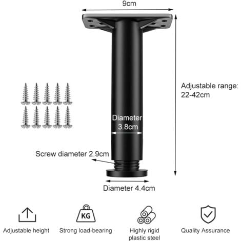 Remarque : vous pouvez obtenir une stabilité maximale en n'ajustant pas les pieds à la hauteur maximale maximale. Support Cadre De Lit Réglable Lot De 2 Pied De Lit Réglable 8cm Pieds Pour Sommier à Lattes Armoire Canape Noir Support Cadre Lit Sommier à Lattes Pied de support central du cadre de lit : évitez l'affaissement ou la rupture des sommiers à lattes et des cadres de lit ! Pieds de meubles Pieds Réglables Ajustable Inox De Hauteur argent 180mm... Parfait comme support de lit, poutres centrales ou pieds de meubles pour armoires / canapés. Convient pour sommier à lattes de 80 x 200 cm, cadre de lit 120 x 200 cm ou comme extension de pieds de table. Cadres De Lit Réglables 4 Pièces Cadre De Lit pour Base Réglable Pieds... Charge maximale de 450 kg et durabilité : les pieds de support réglables en hauteur sont fabriqués en acier à haute résistance avec des parois tubulaires épaisses. Nos pieds de support de lit en métal réglables en hauteur offrent un soutien robuste pour les lits king size, les sommiers à lattes de 80 x 200 cm et plus. Comprend des plaques de montage et des vis pour les trous ou l'installation sans trous. Lot de 2 Pied de Lit Réglables 18-33cm Blanc Pieds pour Sommier à Idéal pour cadre de lit de 120 x 200 cm ou rehausseur de meuble de 20 cm - Protégez votre matelas et économisez des coûts de réparation. Les pieds de meubles ont une base de 6 cm de large (+50 % vs.