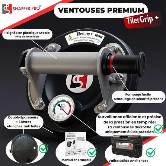 Maintien sûr sur carrelage, vitre, verre ou métal. Chez Shaffer pro, nous travaillons activement sur la conception de nos produits afin qu'ils soient le plus fidèle aux besoins de nos clients et cela fait toute la différence sur votre satisfaction. La ventouse TilerGrip+ est née sur les chantiers, testée dans les conditions les plus exigeantes. LES OUTILS SHAFFER PRO INDISPENSABLES Plus qu’un outil, c’est un partenaire de confiance, conçu pour durer et performer sans compromis. UlisemVentouses - capacité de charge jusqu'à 110 kg ventouses... 🔄 Polyvalence Totale – Verre, Carrelage, Gréscérame, Meuble, Métal Idéales comme ventouses carrelage, ventouses vitres ou lève-meubles. ✔️ Panneaux solaires (pose et manipulation sécurisée) Tous nos produits sont SATISFAIT OU REMBOURSE 30 JOURS. Ventouse Pour Vitre DEWINNER Lot De 2 Ventouses En Verre De 20,3 Cm Avec Manomètre – Lève-vitre Robuste Avec Ventouse Parquet Shaffer Pro TilerGrip - 2 Ventouses Carrelage 200mm avec Manomètre - 320kg Ventouses Professionnelles pour Carreaux, Vitres, Grès Cérame - Forte Aspiration, Valise Incluse : : Commerce, Industrie et Science🧲 200 mm avec Manomètre - Aspiration Puissante & Fiable Ventouses de 200 mm avec manomètre intégré pour un contrôle précis du vide. Maintien sûr sur carrelage... Confort d’utilisation prolongée et sécurité maximale sur tous types de chantiers. Conçues pour les professionnels du carrelage, ces ventouses assurent une manipulation sécurisée des carreaux XXL. 🧱 Pose Carrelage Grand Format – Jusqu’à 160 kg par Ventouse ok pour grés cérame. Parfaites pour la pose de panneaux, fenêtres, plans de travail, dalles grand format, et plus encore. Ventouse Pour Carrelage Outils Manutention Ventouses Professionnelles Lot De 2 - Capacité 200 Kg Avec Manomètre - Pour Carrelage, Verre, Marbre Outils Manutention Lourde Ventouse Vitrier ✋ Ergonomie Renforcée – Poignée Sécurisée & Confortable Poignée antidérapante optimisée pour une prise en main sûre, même avec des gants. ✔️ Verre et vitres (baies vitrées, fenêtres, pare-douches) ✔️ Stratifié et mélaminé (plans de travail, meubles, panneaux) ✔️ Carrelage (grès cérame, faïence, carreaux grands formats)
