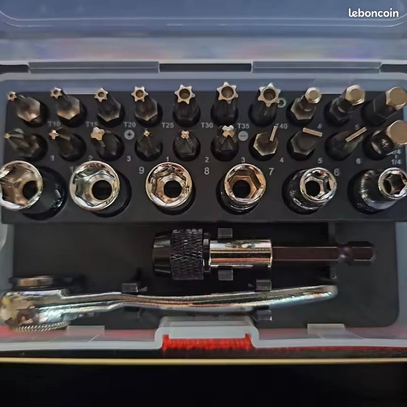 Clé à Cliquet 1/4 Réversible 72 Dents à Dégagement Rapide avec Douilles Hex Mini Tournevis à Cliquet Ensemble de mini clé à cliquet 28 en 1, contenant 1 clé à cliquet, 19 embouts de tournevis, 1 embout de conversion 1/4, 6 douilles et 1 porte-embout. Diamètre de la tige: 6,35 mm / 1/4 pouce Clé à cliquet 1/4 de conception ergonomique, poignée lisse micro-courbée pour une prise confortable, 72 dents offrant une résistance élevée au couple et une conception à dégagement rapide permettant une installation ou un remplacement rapide de la tête de tournevis. - Livré avec une boîte en plastique robuste de dimensions 12., 2 x 7., 6 x 3 cm pour un transport facile et un rangement organisé de tous les accessoires Jeu de douilles pour Tournevis à cliquet 28 en 1, outil de démontage pour ordinateur Taille Porte-embout: Longueur: 60mm / 2,4 pouces La clé à cliquet est fabriquée en Cr-V avec une surface antirouille et une poignée ergonomique confortable et antidérapante. Ce coffret de mini-clés à cliquet 28 en 1 comprend une clé à cliquet, 19 embouts de tournevis, un adaptateur 1/4, 6 douilles et un porte-embout. La mini-clé à cliquet est fabriquée en alliage CR-V pour une excellente résistance à l'usure et une longue durée de vie, tandis que les mini-embouts de tournevis sont fabriqués en alliage d... Emballage de boîte en plastique avec identification dimensionnelle claire sur le compartiment de rangement et la clé ainsi que sur chaque pièce de embouts de tournevis / douilles hex pour un rangement et une utilisation faciles. Description du produit Mesee Coffret de Mini Clé à Cliquet Douilles Embouts de Tournevis et Porte-Embout - Grâce aux graduations de laser clair, vous pouvez identifier rapidement les douilles ou les clés à douilles de taille différentes. Spécifications Embouts de tournevis: Embout de tournevis à tête torx creux: T10, T15,T20,T25,T30,T35,T40 Embout de tournevis à tête hexagonale: H4., 0, H5., 0, H6., 0 Embout de tournevis à tête cruciforme: PH1, PH2, PH3 Embout de tournevis à tête cruciforme: PZ1, PZ2, PZ3 Embout de tournevis à tête plate: SL4, SL5, SL6 Embout conversion & Douille Douilles:5mm, 6mm, 7mm, 8mm, 9mm, 10mm Embout de conversion: 1/4-1/4 Clef Passe Partout Sollbry Kit De 28 Mini Clé à Cliquet Douilles Embouts De Tournevis Et Porte-Embout, Clé à Mini Cliquet Cikonielf Kit d'embouts de tournevis Mini clé à cliquet Kit fente... Briser les contraintes d'espace, cet ensemble de mini clé à cliquet et tête de tournevis est adapté pour fonctionner dans un espace étroit et peut être utilisé pour la réparation commune de petits appareils électroniques, le serrage des vis et d'autres travaux.