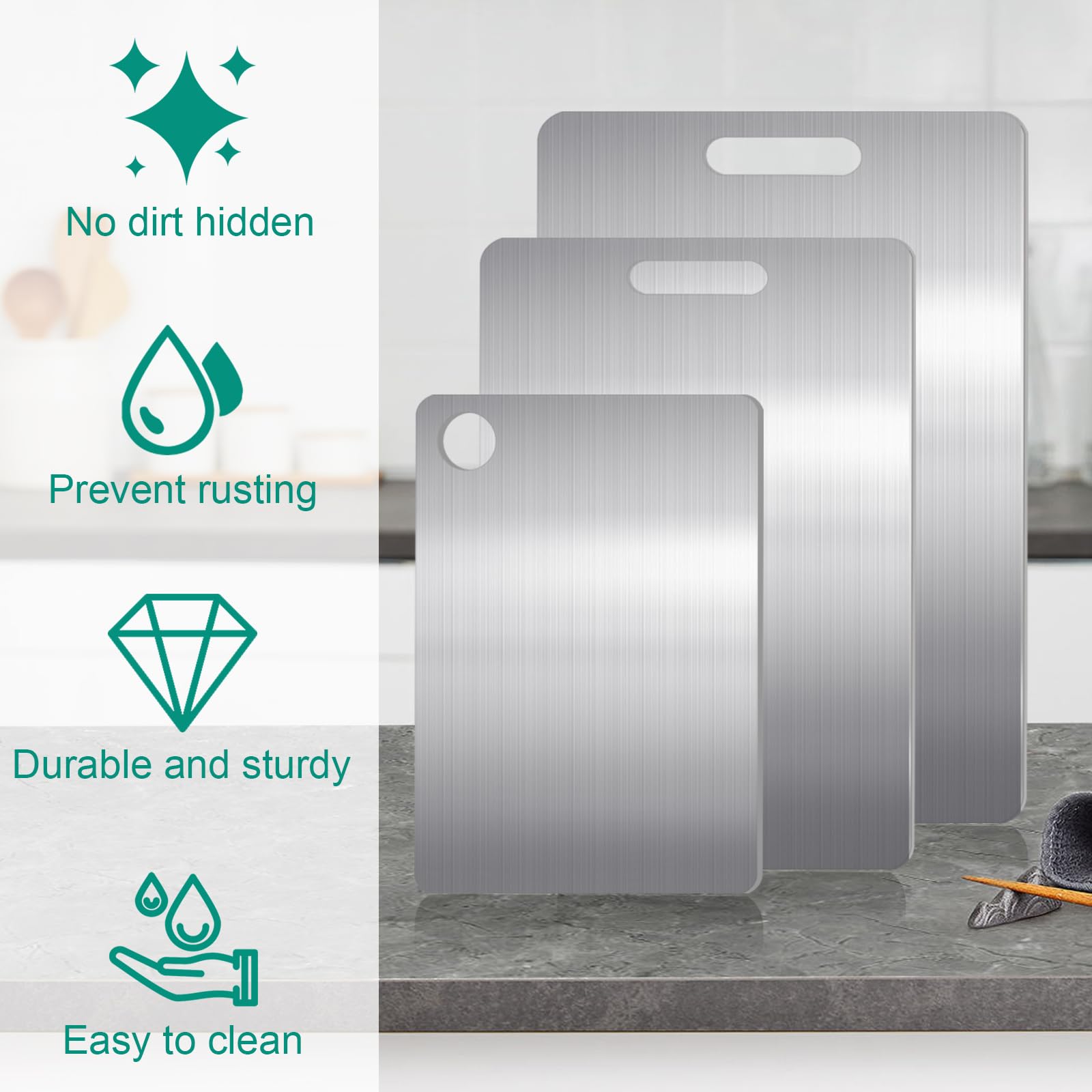 Ces trois tailles offrent une combinaison flexible pour couvrir toutes les étapes de la préparation des aliments. Lot de 3 planches à découper en titane S316 - En acier inoxydable - Double face - Qualité alimentaire - Pour légumes ... Pour couper la viande,les légumes,les... Facile à nettoyer : La nature hydrophobe de l'acier inoxydable permet d'éliminer rapidement les résidus d'un simple rinçage. Matériau : acier inoxydable 316., Angle : 29 x 20 cm, 34 x 23 cm et 39 x 28 cm. Planche Inox 316 Double Face Lot De 3 Planches à Découper En Titane - Planche à Découper En Acier Inoxydable S316 - Planche à Découper En Titane Double Face De Qualité Alimentaire - Planche à Découper En Planche Cuisine Hygiénique Lave-vaisselle Les coins arrondis éliminent les risques de rayures. Kocusu Lot de 3 Planche à Decouper en Titane,Double Face Inoxydable 316 Planche en Titane Pour Viande,Fruits,Légumes,29x20cm,34x23cm & 39x28cm Caractéristiques : 1., Les tailles graduées en trois parties (29 x 20 cm/34 x 23 cm/39 x 28 cm) couvrent scientifiquement des scénarios tels que l'alimentation ajoutée aux fruits, la transformation de la viande et le pétrissage de la pâte à légumes. Acier inoxydable de haute qualité : Fabriquée d'une seule pièce en acier inoxydable 316 avec une finition brossée anti-traces de doigts, elle offre une sensation antidérapante et une finition impeccable. Les taches tenaces peuvent être placées directement au lave-vaisselle. Réversible : Un côté de la planche en titane est dédié aux fruits et légumes, tandis que l'autre est dédié à la découpe de la viande, évitant ainsi toute utilisation croisée. Paramètres du produit : Nom du produit : lot de planches à découper en titane. Un ensemble trois pièces parfait : La planche a decouper titane est disponible en trois tailles : la petite planche de 29 x 20 cm est idéale pour hacher finement les fruits et les céréales complètes, la moyenne de 34 x 23 cm est idéale pour la viande, et la grande planche de 39 x 28 cm offre un espace généreux pour couper les légumes et pétrir la pâte. Facile à utiliser : CUBTEM propose trois tailles : 39 x 28 cm, 29 x 20 cm et 25 x 15 cm pour une utilisation polyvalente. La surface en titane est robuste... Les mesures d'hygiène et l'utilisation efficace de l'espace de cuisine sont prises en compte et répondent aux deux normes de durabilité professionnelle et de santé familiale. Polyvalente : Qu'il s'agisse de gérer les divers besoins quotidiens en ingrédients à la maison ou les tâches exigeantes et fréquentes d'une cuisine de restaurant, du tranchage de fruits, de légumes et de viande au pétrissage de la pâte, c'est un outil de cuisine pratique et essentiel pour gagner de la place et améliorer l'hygiène. Lot de 3 planches de cuisine en titane 100% - Nouvelle