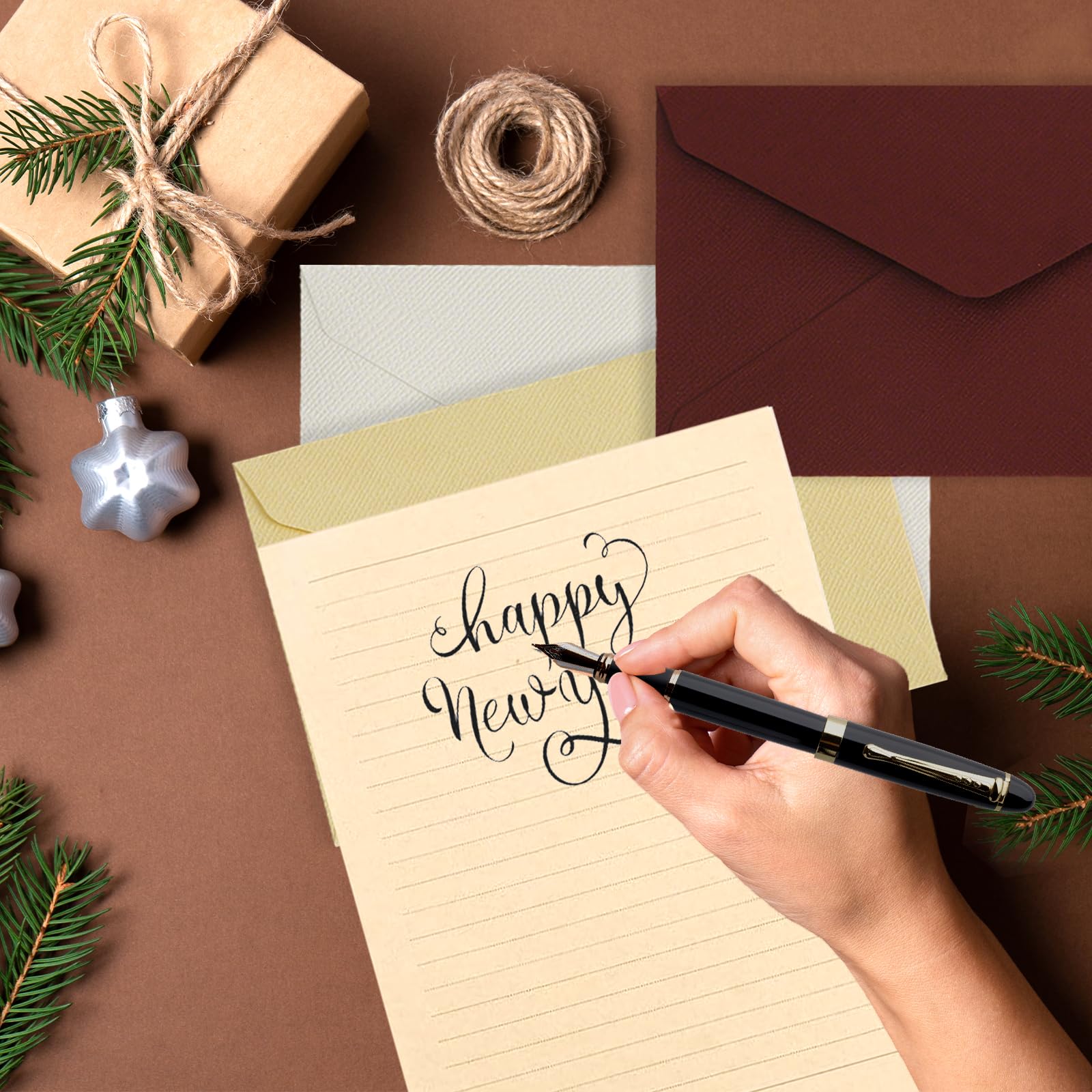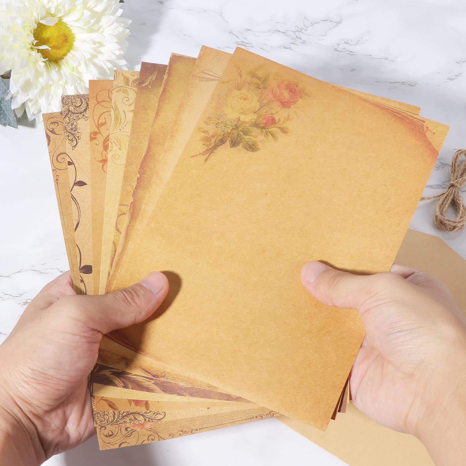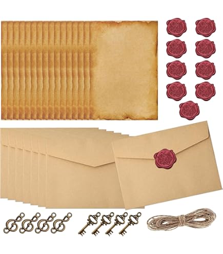 En outre, les papiers sont ornés de jolis motifs rétro qui rappellent les feuilles Diddl et donnent aux lettres une touche unique., Sceau de cire non proche de sources de chaleur., Ensemble écriture Manuscrite Foonary Lot De 33 Feuilles De Papier à Lettre Vintage Avec Enveloppes Lin Sceau Cire Lot de papier à lettre vintage et enveloppes comprenant 20 feuilles de... Ensemble complet de 33 pièces vintage : ce lot comprend 9 enveloppes en lin, 15 papiers à lettre A5 et 9 sceaux de cire – comme papier à lettre classique avec enveloppe, il offre tout ce dont vous avez besoin pour les lettres manuscrites. Aperçu des avantages du produit : 33 pièces : 9 enveloppes en lin, 15 papiers à lettre A5, 9 sceaux de cire – tout le nécessaire pour écrire instantanément sans acheter de pièces supplémentaires. Remarque : conserver au sec, à l'abri de l'humidité, du soleil fort. Chaque fermeture avec sceau de cire fait de l'envoi de lettres une expérience particulière Les lettres ont un look vintage subtil, semblable au papier parchemin vintage, qui transmet le charme des temps passés Dimensions assorties : papier à lettre 21 x 14,5 cm (A5), enveloppes 16 x 11,3 cm – Parfait pour les uns aux autres, lettres faciles à emboîter, pas de plis. Parfait pour les lettres d'amour et différentes occasions : que vous écriviez une lettre d'amour chaleureuse, que vous créiez des invitations pour un anniversaire ou des lettres de fête pour des fêtes de famille, ce papier à lettre avec enveloppe s'adapte à tous ces scénarios. Informations sur la série et données techniques : Nom du produit : lot de 33 feuilles de papier à lettre vintage Foonary Contenu de la livraison : 9 enveloppes en lin, 15 papiers à lettre A5, 9 sceaux de cire. 102 Pièces Enveloppes de Papeterie, Papeterie Vintage avec Enveloppe... Matériau élégant et charme rétro : les enveloppes en lin se caractérisent par une texture douce, tandis que les papiers à lettre A5 sont élégants comme papier à lettre – ni trop fin, ni trop épais, parfaits pour écrire avec une plume ou un stylo à bille. Sceau de cire décoratif pour plus de charme : les 9 sceaux de cire fournis sont parfaits pour fermer des lettres ou des enveloppes – avec le papier à lettre vintage de type papier parchemin, ils créent une atmosphère rétro harmonieuse. Matériau d'écriture agréable : papier à lettre lisse, pas trop fin – bon pour stylo à bille / plume, pas de transparence d'encre. Lot de 175 feuilles de papier à lettre - 50 feuilles de papier à lettre