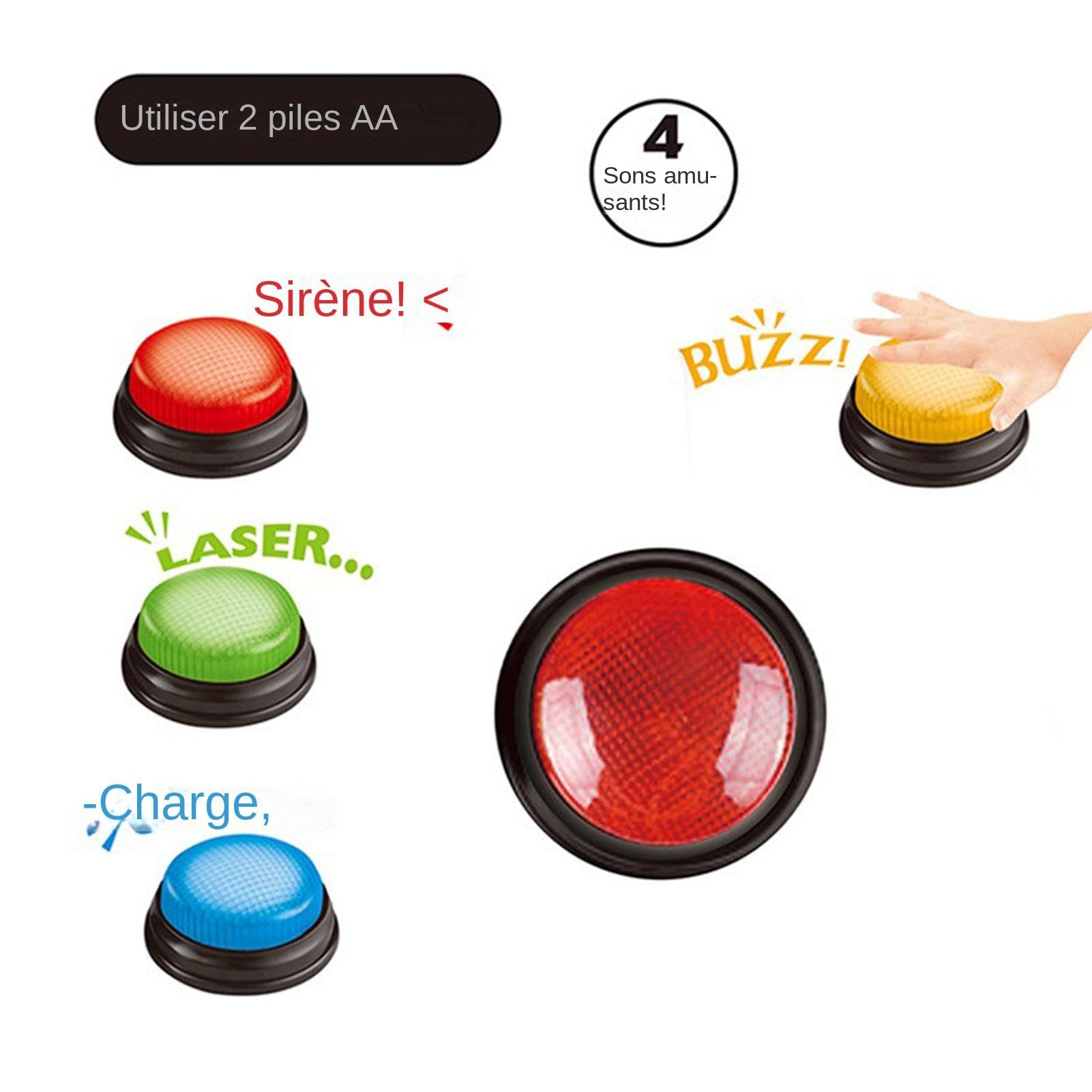 BEAN LIEVE Answer Buzzers pour enseigner avec Salle de Classe, Joue... Le buzzer est fabriqué en plastique solide, peut résister à plusieurs chocs, n'est pas facile à déformer et peut être utilisé pendant une longue période. Fonctionne sur piles, nécessite 2 piles AA par buzzer (piles non incluses) pour une utilisation pratique n'importe où. Buzzer Blind Test QWORK Lot De 4 Buzzers De Réponse Pour Quiz, Sonneries De Blind Test Musical Comprend quatre buzzers amusants et interactifs, chacun avec des sons uniques: Sirène, Buzz, Laser et Charge. Des buzzers aux sons différents qui imitent des objets du monde réel, pour animer vos cours et les rendre encore plus ludiques ! Un excellent moyen de stimuler la réponse des élèves lors de toute activité ou jeu en classe. Styles d'apprentissage : visuel, tactile, auditif Nous simplifions les choses et nous assurons que vous obtenez le meilleur pour moins cher. Lot de 4 buzzers sons et lumières - Lights and Sounds Buzzers (Set of 4