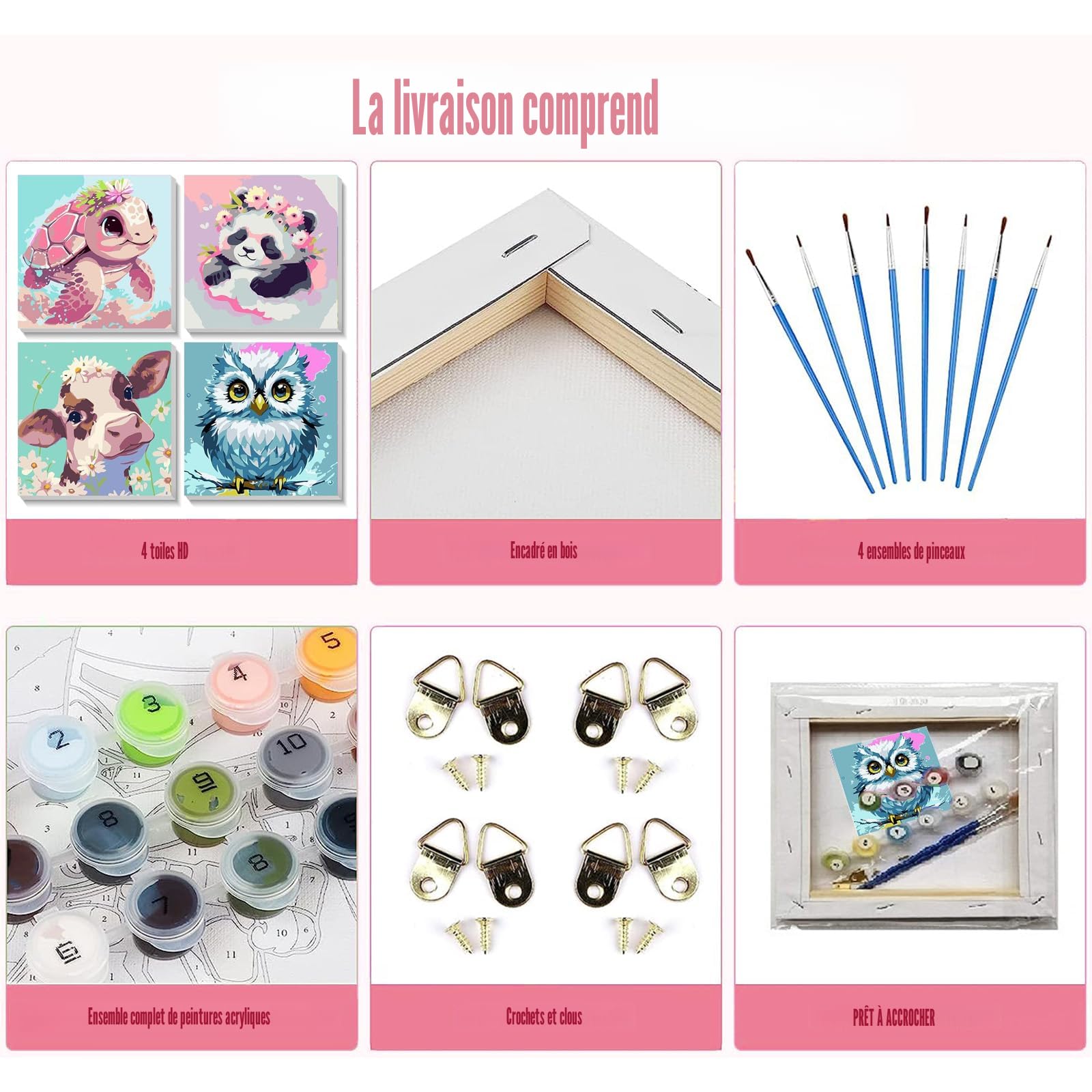 Symboles et chiffres clairs, texturés et bosselés, faciles à colorier. LOITTAINUE Lot de 4 peintures par numéros à partir de 5, 6, 7, 8, 9 ans, filles et garçons - Peinture par numéros - Pour enfants et débutants - Avec pinceaux et Le kit de peinture par numéros MXJSUA est un cadeau attentionné pour les vacances, les anniversaires et les événements spéciaux comme le Nouvel An, Noël ou la Saint-Valentin. Peinture Par Numéros Animaux Cadres MXJSUA Lot De 4 Kits De Peinture Par Numéros Animaux Mignons Peinture Acrylique Activité Créative 6-12 Ans Idéal pour les débutants, le système numéroté guide les enfants étape par étape pour terminer leur œuvre d'art, renforçant leur confiance et leur donnant l'impression d'être de vrais artistes. Cadre en bois Notre toile de peinture numérique est montée sur un cadre en bois robuste, vous n'avez donc pas besoin de recadrer votre œuvre d'art après l'avoir terminée. Peinture par numéros animaux, numéro d'art animaux, peinture par numéro... Il suffit d'associer les numéros sur la toile avec la peinture correspondante pour une expérience enrichissante. 3 : Collez-le au mur avec nos velcros assortis CONTENU DU PRODUIT:Le Peintures Acryliques comprend 4 pièces de toile avec 4 motifs différents : tortue, panda, vache et hibou. Le principe est simple... 2 : Accrochez-le au mur avec nos crochets assortis Peinture acrylique Les couleurs de l'ensemble des peintures acryliques sont douces et lumineuses, et les lignes et les chiffres sont faciles à couvrir. Il peut être encadré pour être une excellente décoration pour votre maison. Laissez vos tout-petits explorer les joies de la peinture avec ce kit réfléchi et engageant, garanti pour rendre l'art amusant et sans stress ! Favorise la créativité et la concentration : Le kit de peinture par numéro est un excellent moyen de cultiver la patience, la coordination œil-main et les compétences artistiques des enfants tout en encourageant l'amour de l'art et la concentration.