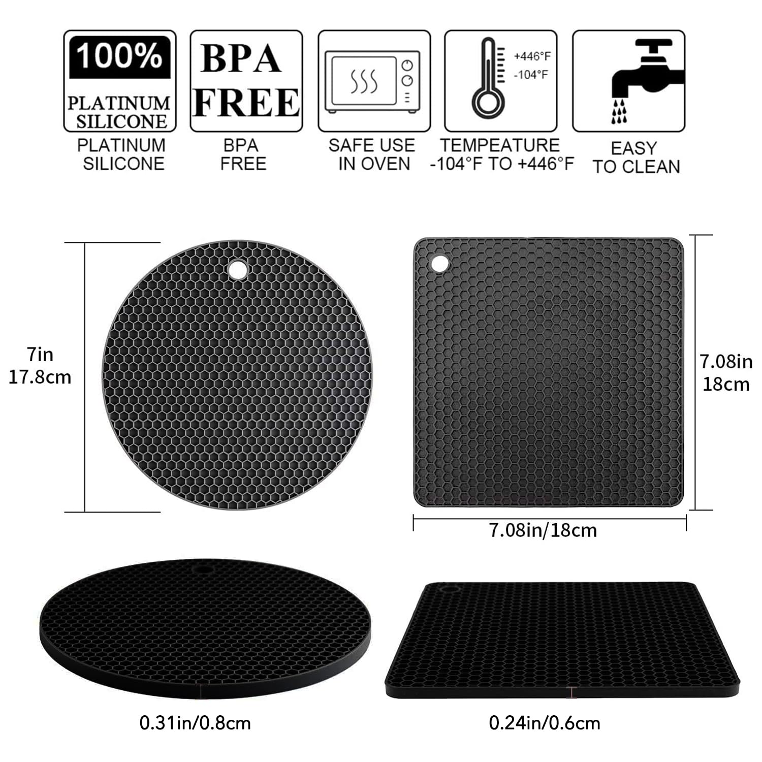 Caractéristiques Résistant à la chaleur Résistant à la chaleur jusqu'à 230℃, parfait comme dessous de plat pour la table, protecteurs de comptoir pour la cuisine résistant à la chaleur, coussin chaud, tapis pour plaque chauffante Sous Plat Casserole Chaude Plaque Sous Poele Lot De 5 Dessous De Plat En Silicone Ultra épais De 8 Mm Pour Plats Chauds, Casseroles Et Poêles, Dessous De Plat En Silicone Pour Protéger La Table Dessous Dessous De Plat 17cm Antidérapant Facile à nettoyer : Fabriqué en silicone de qualité alimentaire, il peut être lavé dans l'évier ou le lave-vaisselle sans risque d'usure, ce qui en fait un produit sûr et respectueux pour vous et votre famille. Ils sont donc particulièrement idéaux comme dessous de plat en liège, tapis chauffants pour la cuisine ou tapis en silicone résistant à la chaleur dans les petites cuisines qui ne disposent pas de beaucoup d'espace de rangement. Utilisations Multiples : le set de table créatif multi-usages peut également être utilisé comme dessous de plat en liège, tapis pour cafetière, petit tapis en silicone ou tapis pour plaque chauffante, selon vos besoins ! Empilable : Composés de plusieurs motifs de marguerites, ces dessous de plat sont conçus pour s'emboîter les uns dans les autres, ce qui vous permet de les empiler facilement pour un rangement peu encombrant. STAUB Dessous de Plat Aimanté, Ovale, 21 cm, Bois Hêtre Avec son magnifique motif de marguerite, ce dessous-de-plat en silicone ajoute du style et du charme à la décoration de votre cuisine. Design antidérapant Idéal comme tapis de cafetière, porte-casseroles en silicone, petit tapis en silicone ou tapis de cuisine en silicone lorsque vous manipulez des plats ou des casseroles chaudes, même sur des surfaces lisses telles que les comptoirs et les tables de cuisine. Ce dessous-de-plat est indispensable dans votre cuisine, car il offre de nombreuses possibilités de protection pour les casseroles et poêles chaudes et les surfaces de votre maison. Résistant à la chaleur Ils sont donc particulièrement idéaux comme dessous de plat en liège, tapis chauds pour la cuisine ou tapis en silicone résistant à la chaleur dans les petites cuisines qui n'ont pas beaucoup d'espace de rangement disponible. sous-Plat en Bois - Enseble De Dessous-de-Plat Pliable en Fore d... Tapis pour casseroles chaudes résistant à la chaleur et antidérapant... Ce dessous-de-plat est flexible et facile à laver, vous n'aurez donc pas à vous soucier de le relaver après chaque utilisation. Ce tapis résistant à la chaleur offre une protection supplémentaire contre les températures élevées, sans se casser ou s'user prématurément comme le font les dessous-de-plat traditionnels en liège. Facile à nettoyer Fabriqué en silicone de qualité alimentaire, il peut être lavé dans l'évier ou au lave-vaisselle sans risque d'usure, ce qui en fait un produit sûr et attentionné pour vous et votre famille. Ce porte-casseroles rond en silicone de 17 cm est non seulement antidérapant, mais aussi résistant à la chaleur, ce qui en fait le dessous-de-plat idéal pour votre cuisine.