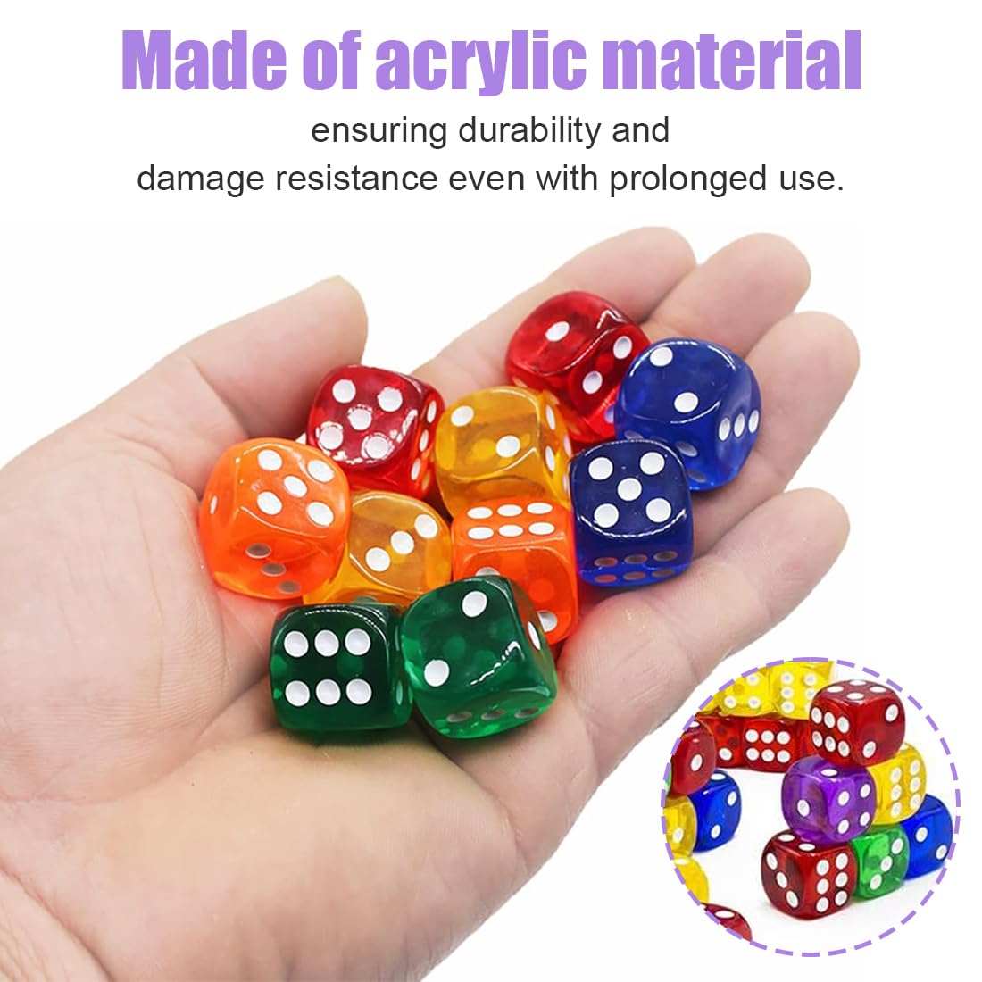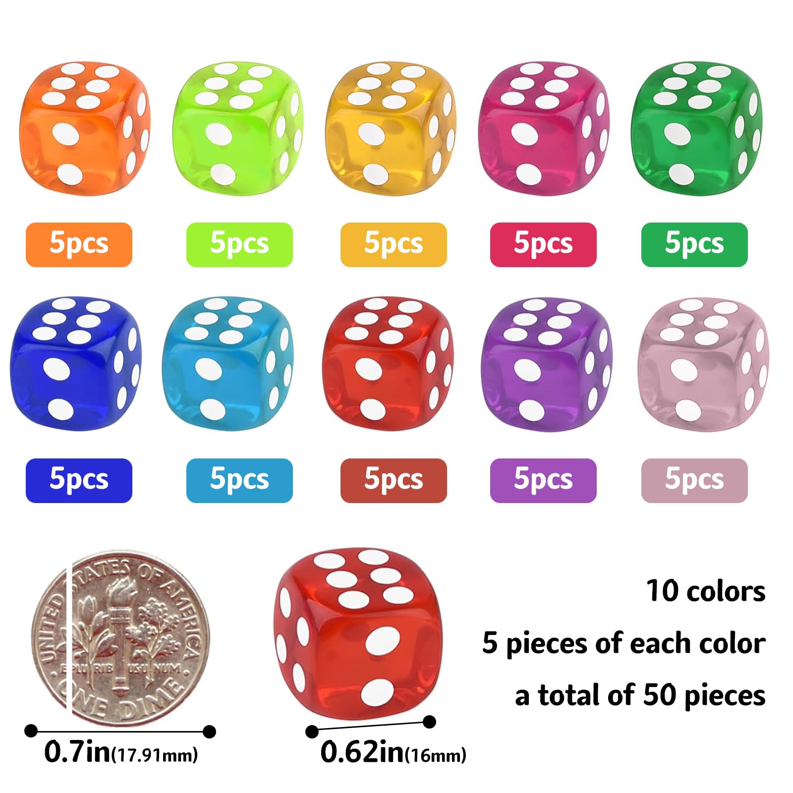 Shipenophy jeu de dés à 6 faces Jeu de dés en acrylique, 20 pièces Dés Acrylique Transparents Dés 6 Faces Lot De 50 Dés à 6 Faces De 14 Mm, Couleurs Translucides, Avec Trop Dure I.a Dice Dés Pédagogiques Mathématiques Nos jeux de dés, fabriqués en acrylique de haute qualité, offrent un design robuste qui résiste à une utilisation fréquente. Les bords arrondis et lisses permettent de rouler facilement, tout en conservant les couleurs vives et en résistant aux dommages Ensemble riche pour un maximum de plaisir de jeu : Recevez un lot complet de 50 dés à jouer de haute qualité en 10 couleurs transparentes éclatantes, 5 dés par couleur ; cette quantité généreuse est idéale pour des jeux de dés entre amis et en famille ou comme remplacement parfait pour des dés perdus. Lot de 40 Dés à jouer - ATYHAO - Jeu de dés 12 faces - 5 couleurs - Pour jeux interactifs et... Polyvalents pour les jeux et l’apprentissage : Ce lot de dés est le compagnon parfait pour d’innombrables jeux de société, jeux de dés comme Yathzee, Farkle ou jeux de rôle sur table ; également excellent comme outil pédagogique pour les cours de mathématiques et les jeux de rôle, pour pratiquer le comptage, la probabilité et les calculs. Matériau de qualité supérieure et sensation agréable : Fabriqués en acrylique durable avec des coins arrondis, ces dés offrent un roulement doux et silencieux par rapport aux dés traditionnels ; les points blancs clairs et bien lisibles sur un fond coloré garantissent une reconnaissance rapide à chaque lancer.
