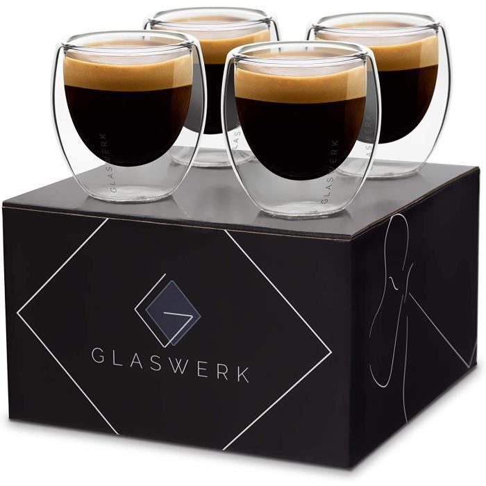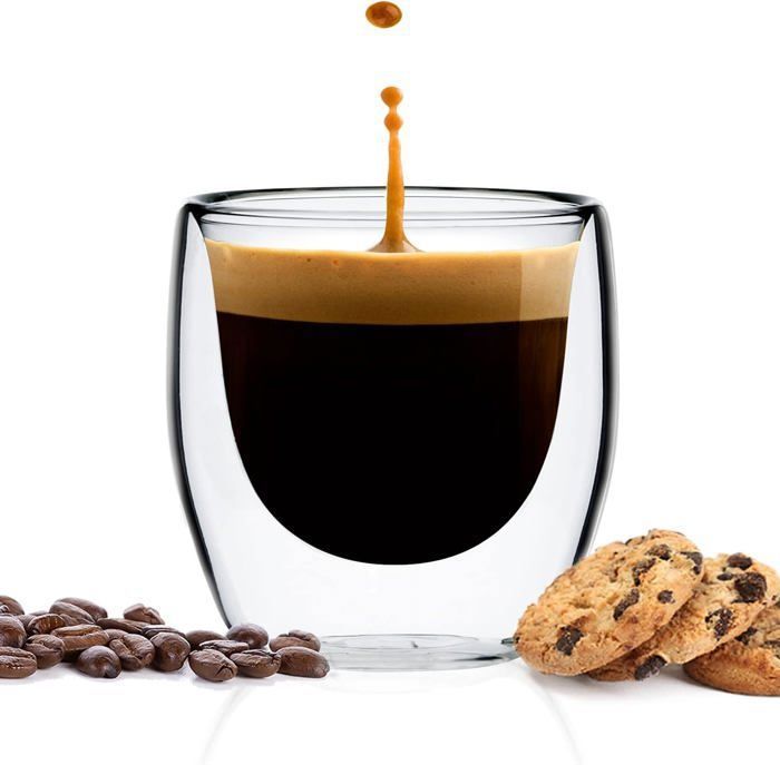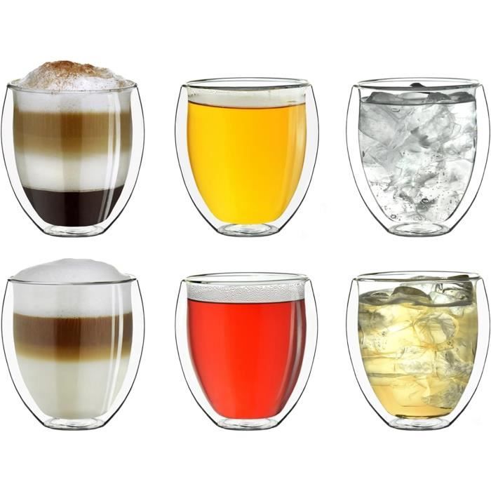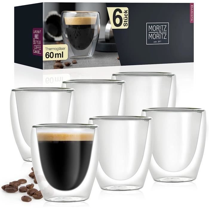 Tasses Moka 100ml Creano Verres à Expresso à Double Paro, Lot De 6 100 Ml, Tasses à Moka, Verres Thermques à Verres Lave-vaisselle Micro-ondes Verres à expresso à double paroi, lot de 4 - Maxxo Verres À Double Paroi 250 Ml Dg-Bully, Lot De 6, Grand Verre Thermo À Double Paroi En Verre... Donne l'impression que les boissons flottent dans la tasse, offrant une expérience visuelle distinctive. De plus, aucun phénomène de condensation ne se produit, ce qui évite les traces d'eau gênantes sur la table. **CARACTÉRISTIQUES PRATIQUES** :Mesurant 7 cm x 7 cm de diamètre, il est petit et raffiné, créant une scène magnifique au bout de vos doigts (de légères variations sont possibles en raison de la production manuelle). Grâce à leur paroi double, les verres restent toujours à température ambiante à l'extérieur, éliminant tout risque de brûlure. Les verres sont résistants aux chocs, aux rayures, et compatibles avec le lave-vaisselle, le micro-ondes et le congélateur. **GARANTIE DE SATISFACTION** : Nous sommes à votre disposition pour toute question ou problème. Notre service clientèle compétent et sympathique vous garantit une solution 100% satisfaisante ! Verres à double paroi Ripple 450 ml, lot de 2 verres à latte macchiato à double paroi,... | bol