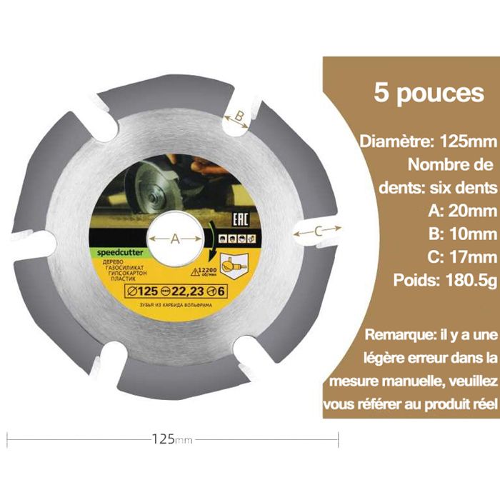 Outil Travail Du Bois Disque Coupe Bois 5 Dents - Pour Meuleuse Livrée avec roulement et bague de blocage. · Sans bague de copiage, ni aucun calcul, cette fraise munie d'un roulement permet le copiage au gabarit Disque Bois Meuleuse Raboteuse Rotative De 90mm De Diamètre, Disque De Sculpture Disque à Dents Pour Travail Du Bois 6 dents/8 dents offrent un meulage et un polissage doux et contrôlables for maximiser les performances de meulage. Applications : travail du bois, sculpture sur bois, sculpture sur racines, plateau à thé poli, table basse. SINMI Meuleuse d'angle disque de sculpture sur bois 125mm meule à bois... Il peut être utilisé for le travail du bois, la sculpture sur bois, la sculpture de racines, le polissage des plateaux à thé, des tables basses, etc. Caractéristiques : lame hexagonale, raboteuse rotative, disque de sculpture sur bois, meule d'angle, accessoire, sculpture de pièces d'artisanat en bois., Note:1., Veuillez permettre une erreur de 0 à 1 cm en raison de la mesure manuelle. Fabriqué dans un matériau de haute qualité, durable et pratique à utiliser. veuillez vous assurer que cela ne vous dérange pas avant d'enchérir., 2., En raison de la différence entre les différents moniteurs, l'image peut ne pas refléter la couleur réelle de l'article., Merci!