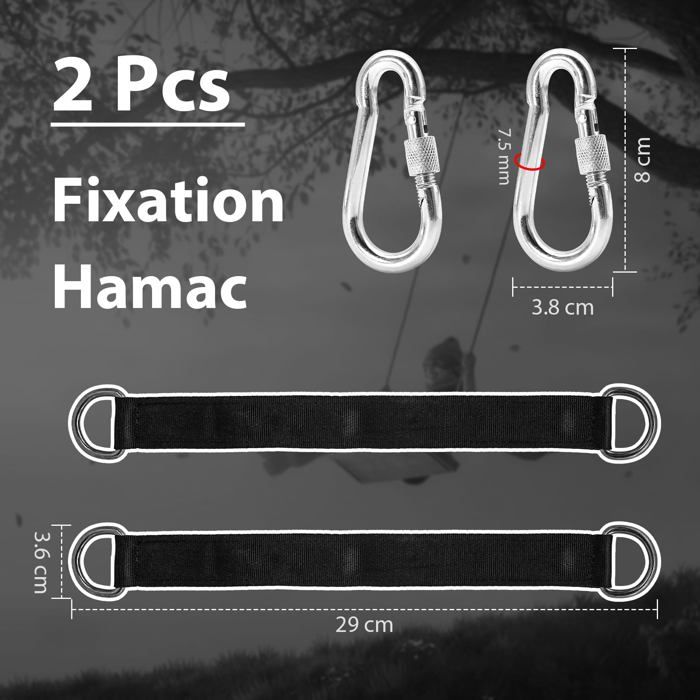 Sangle Nylon 400kg Sangle Hamac,Sangle ,Fixation De Balançoire Pour Hamac Pour Arbres 2x150cm Avec Balancoire Arbre Mousquetons Acier Fixations Hamac YdseozOA [Lot De 4] - Sangle Hamac Sangles Camping Hamac Arbre Sangles de Suspension pour Une... Ce kit de suspension vous offre tout le nécessaire pour fixer solidement votre hamac. Matériaux de qualité supérieure : La fixation de la balançoire est en sangle de nylon. Capacité de charge fiable : Le kit de suspension pour balançoire d'arbre est conçu pour une stabilité maximale grâce à un cadre robuste. Le kit comprend : 2 sangles de hamac de 30 cm et 2 crochets à écrou. Installation facile : Aucun perçage ni outil compliqué requis. Enroulez simplement la sangle de la balançoire autour d'une branche, d'une poutre ou d'un poteau solide, ajustez-la à la hauteur souhaitée et fixez-la solidement au mousqueton fourni. Largement utilisé : Convient à une variété de meubles suspendus, notamment les balançoires d'arbre, les balancelles, les balançoires de terrasse, les balançoires pneumatiques et même les sacs de sable. Contenu du Paquet: Le kit comprend 2 sangles de hamac, 2 boucles de sécurité et 2 anneaux en D. Idéal pour une utilisation en intérieur comme en extérieur, que ce soit pour un moment de détente ou de divertissement
