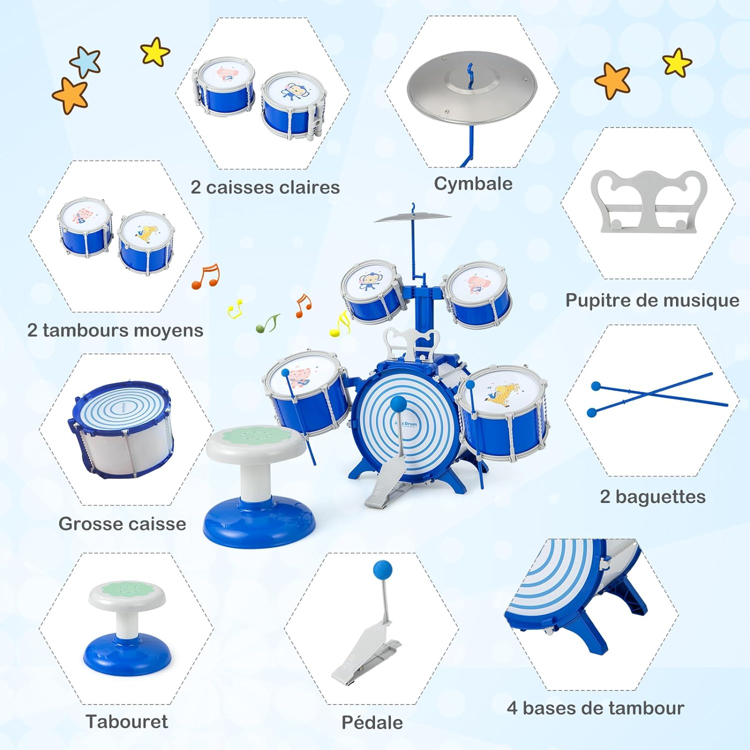 Tambour Enfant Tabouret Inclus Shayson Tambours Enfants, Kit De Batterie Enfant 6 Pièces, Noir, Jazz Rock Drum Set Pour Enfants Avec Tabouret Percussion, Anniversaire Noël Pour Les à Partir De 1 2 3 4 5 6+ Ans Batterie Enfant Jouet Kit de batterie pour enfants tout-petits en bois – éducation Batterie pour enfant ⇒ top 13 pour les musiciens en herbe Batterie pour tout-petits : le kit de batterie pour enfants est mis à niveau en plastique et en alliage avec 5 lumières de contrôle des vibrations de couleur, y compris une grosse caisse avec pédales, 2 tambours moyens, 2 petites tambours, une cymbale, 2 baguettes avec housse en mousse et un tabouret stable. Batterie sur le thème des étoiles : notre batterie pour enfants imite le design étoile du ciel nocturne, design de tambour bleu super cool, étoiles colorées pointillées le ciel nocturne, de sorte que cette batterie de jazz pour enfants est réaliste et mignonne, appréciée par les enfants. C'est un bon choix de jouets éducatifs musicaux pour les enfants. Description du produit Ensemble de batterie pour enfants de 3 à 5 ans, grande batterie de jazz améliorée pour enfants, instruments de musique et tout plastique, kit de percussion pour débutants de 3, 4, 5, 6 ans Avertissement De Sûreté À partir de 3 ans Tambour biseauté à 30 °, convivial et confortable pour les tout-petits âgés de 3 à 5 ans. Notre batterie de jazz permet aux enfants de jouer confortablement et chaleureusement Cadeau musical pour enfants : le kit de batterie pour débutants pour enfants peut être démonté en tambours individuels, ce qui en fait un excellent choix pour les jouets musicaux, que ce soit pour jouer avec des amis ou seul. Téléchargement – Coloriages numérotés pour les tout-petits de 1 à 5...