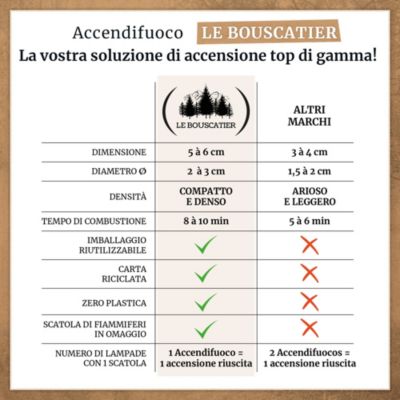 Allumage facile Avec leur combustion longue (8 à 10 minutes), quelques allume-feux suffisent pour enflammer efficacement vos bûches ou votre charbon de bois. Ces allume-feu VOYTO sont 100% naturels - juste de la laine de bois et de la cire. Plus d'odeur de kérosène ni de produits chimiques. Un seul briquet suffit... Faciles à conserver, les allume-feux se stockent simplement dans un endroit sec, à l’abri de l’humidité, et restent toujours prêts à l’emploi. Les personnels accompagnés de ESAT viennent travailler directement dans notre lieu de production afin de réaliser, avec soin, des opérations de conditionnement. Allume Feu Bbq Allume-feu Naturel Laine De Bois Et Cire | J'envoie Du Bois Allume Cheminée Barbecue Poêle Conditionnée en boîte de 170 pièces, cette réserve pratique vous accompagne tout au long de la saison de chauffage ou de vos repas conviviaux en extérieur. Fabriqués à partir de laine de bois fine et de cire naturelle, ils assurent un allumage rapide, propre et sans odeur désagréable. Fabriqués à partir de matières premières 100% naturelles, ils ne contiennent aucun additif chimique et garantissent un allumage simple, rapide et sans odeur. ✅ 100% naturel : laine de bois et cire végétale : produit écologique, sans additifs chimiques emballés dans un carton ✅ Boîte d'environ 170 pièces pour un total de 2,2Kg : de quoi faire de nombreuses flambées ! EMBALLE AVEC AMOUR Nous travaillons avec un ESAT de la Métropole Lilloise pour conditionner tous nos produits. Convient pour : Cheminée ouverte , Insert de cheminée , Poêle à bois , Braséro , Four à pizza , Barbecue , Bain finlandais Nos allume-feu laine de bois sont fabriqués à partir de matériaux entièrement naturels, sans aucun additif potentiellement nocif pour votre santé. Nous utilisons des ingrédients respectueux de l’environnement tels que de la cire végétale pour créer de la laine de bois sans odeur, ni résidu JOLIS CARTONS BIEN REMPLIS Nous proposons plusieurs types de conditionnements afin de vous laisser le choix entre le nombre de pièces, la qualité du carton et vous faire ainsi bénéficier des meilleurs prix. ✅ Emballé avec amour ❤️ dans les Hauts-de-France par nos équipes aidés des personnels d'un ESAT allume feu 32 laine de bois 100% végétal