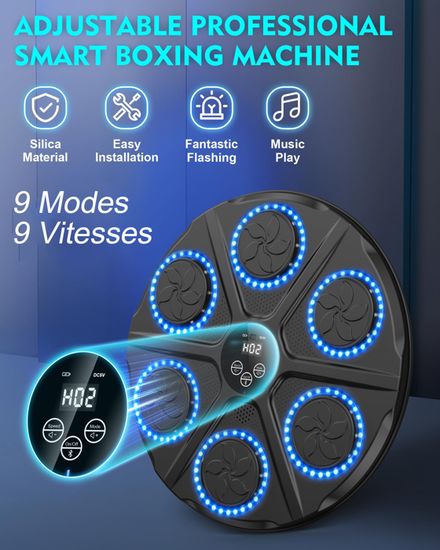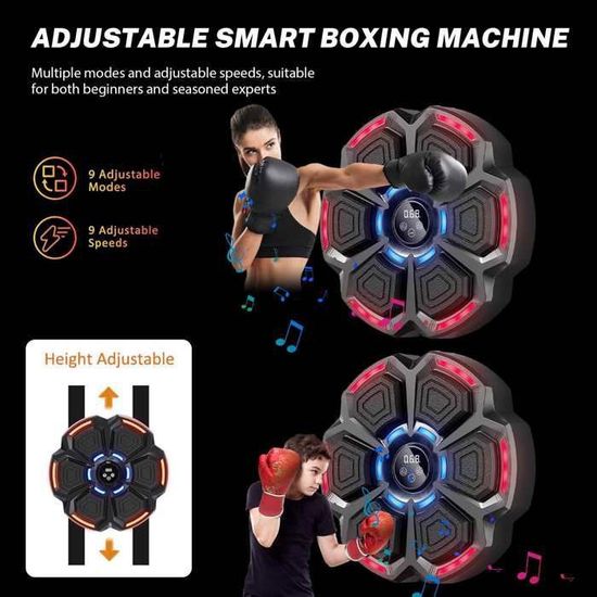 Cible musicale de boxe intelligente Bluetooth, tapis mural de boxe... 🔵【Connexion Bluetooth et Son Immersif】Des haut-parleurs à son surround et une connexion Bluetooth permettent de diffuser de la musique pendant les séances, avec une optimisation audio professionnelle pour une expérience immersive. 🔵【Polyvalence d’Utilisation et Adaptation Multi-Sports】Adapté à la boxe, au Sanda, au Taekwondo et autres arts martiaux, l’appareil convient aux espaces de bureau, salles de sport ou domicile, combinant entraînement physique et divertissement. Machine De Boxe Musicale Adulte Cible Musicale De Boxe Intelligente Bluetooth, Tapis Mural De Boxe Boxing Machine 🔵【Points de Frappe Interactifs Synchronisés à la Musique】Six zones de percussion équipées de lumières RGB clignotent aléatoirement au rythme de la musique, créant un entraînement dynamique pour améliorer la boxe mural musique coordination main-œil et les réflexes. Machine de boxe musicale intelligente Bluetooth : la machine de boxe musicale prend en charge la lecture de musique, connectez votre téléphone mobile Bluetooth, jouez vos chansons préférées et la machine de boxe utilise la dernière technologie de synchronisation des battements pour garder la vitesse de clignotement cohérente avec le... 🔵【Affichage Numérique Intelligent avec Suivi de Données】Un écran tactile LED permet de visualiser en temps réel la vitesse d’impact, la puissance des coups, le nombre de frappes consécutives et d’autres métriques pendant l’entraînement. ENDBAG Máquina de Boxeo Musical para Adultos y niños, Objetivo de Pared