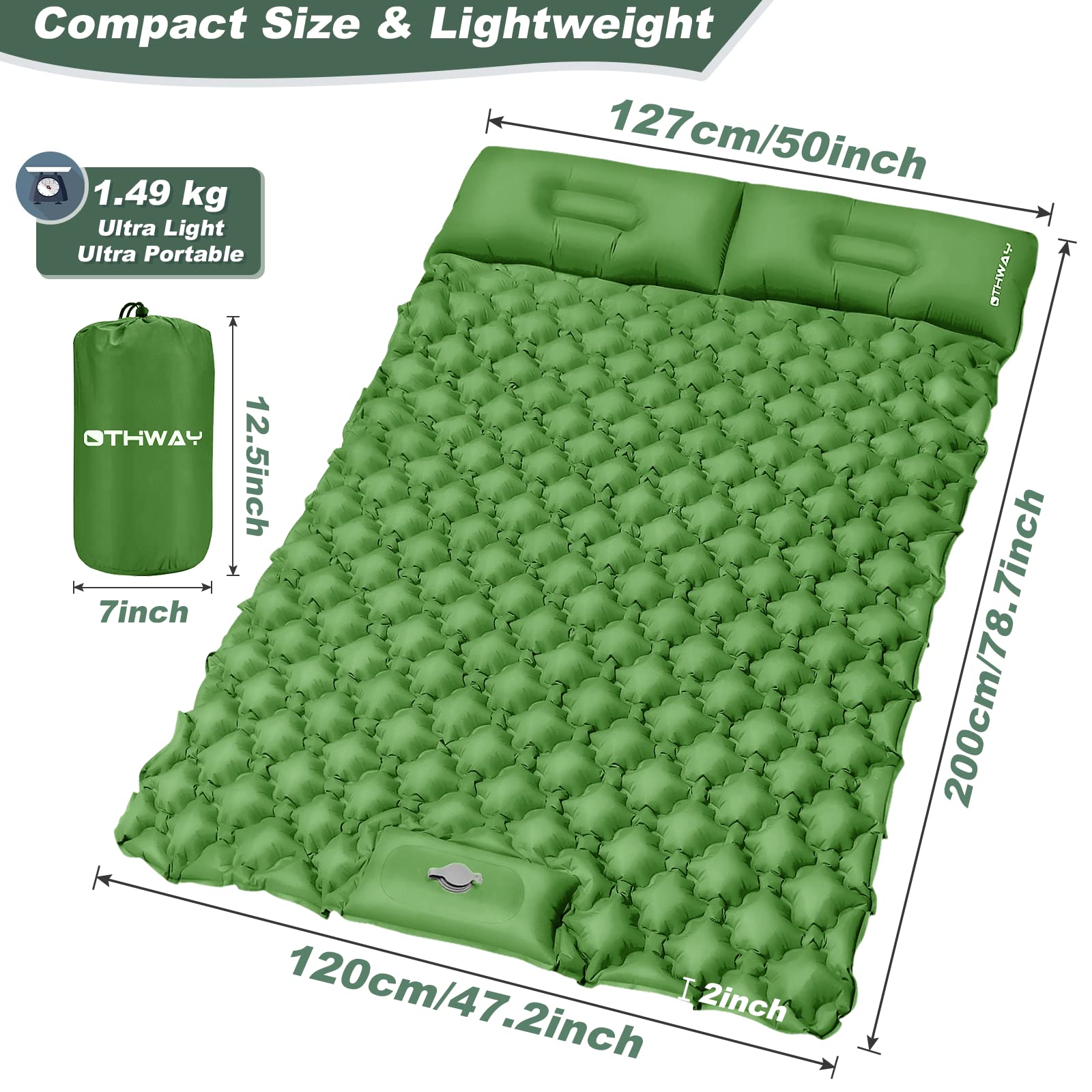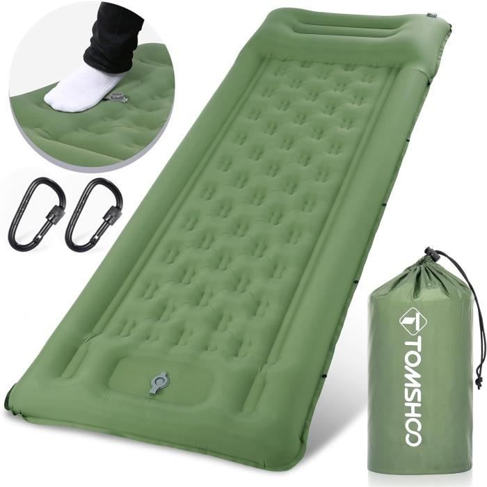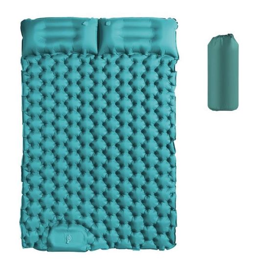Sa surface est facile à nettoyer après le camping. 1 x Sac de rangement , 1 x Instructions Description du produit Asoway Matelas de Camping Autogonflant 2 Personnes, Tapis de Camping Matelas Gonflable Double Ultraléger avec Pompe à Pied et Oreillers Parfait Dites adieu aux outils de gonflage encombrants ! Ce double matelas de couchage gonflable est équipé d'une pompe à pied intégrée à haut rendement qui se gonfle en seulement 2 à 3 minutes, ce qui vous permet d'économiser du temps et des efforts. Tente Gonflable GOPLUS Matelas De Camping Autogonflant 2 Personnes, Tapis De Couchage Matelas Voiture Le paquet comprend : 1 x Sac de couchage , 1 x Lanière Comme le montre l'image de gauche, toute couche de valves mal fermée entraînera une fuite d'air., 2., Lorsque vous appuyez sur la pompe à pied pour gonfler, si vous sentez une forte résistance et qu'il est difficile de la pousser vers le bas, cela signifie que le matelas est complètement gonflé et que la pression d'air est trop faible, ce qui affectera votre expérience., 3., Si vous avez un problème, n'oubliez pas de nous en faire part, nous résoudrons votre problème du premier coup. 【Facile à transporter】Ce matelas de camping se plie et se range en quelques secondes dans le sac de transport fourni (31 cm x 14 cm x 12 cm) après dégonflage. Il se glisse facilement dans un sac à dos ou un coffre. wulwun Matelas de Camping Auto-Gonflant Double, 12-15CM d 3 x Patch de réparation (si le sac de couchage de camping est accidentellement rayé par des objets pointus, il suffit de coller le patch de réparation sur la zone endommagée et de continuer à l'utiliser)., Note : 1., En raison des différents paramètres de résolution des écrans et des différents éclairages, il peut y avoir des différences de couleur entre les couleurs réelles et les photos. Livré avec un grand coussin ergonomique intégré pour soutenir votre cou et éloigner votre corps du sol dur., VEUILLEZ NOTER : 1., Veillez à ce que les deux valves anti-fuites à double couche sur la surface de l'oreiller soient bien fermées avant de le gonfler. Léger et compact, il n'alourdira pas vos déplacements. Résistant aux déchirures, à l'humidité et aux taches, il est doté d'une étanchéité renforcée, ce qui le rend idéal pour les terrains accidentés et les environnements humides. Design unique : plus besoin de gonfler avec la bouche ou de porter une pompe à air avec un tapis isolant pour l'extérieur ! Livré avec un sac de transport qui... MATELAS GONFLABLE CAMPING ULTRALÉGER - POMPE INTÉGRÉE- 190CM... Plus confortable Le coussin gonflable en nid d'abeille répartit la pression, la force est plus uniforme, plus confortable et la capacité de charge est plus élevée. Pour le dégonfler, il suffit d'ouvrir toutes les valves et le dégonflage s'effectue en quelques secondes. Il peut accueillir deux personnes. Son design ergonomique est doté d'une structure à coussin d'air en relief pour un soutien uniforme et un soulagement efficace de la pression corporelle. Plus durable que les matelas de sol ordinaires, il vous accompagnera dans toutes vos aventures en plein air. 【Design spacieux pour deux personnes】Le matelas de camping 2 personnes mesure 192 x 125 cm une fois gonflé et est équipé d'un oreiller extra-épais.